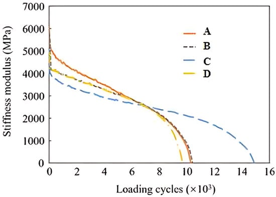 This study evaluated the fatigue performance of various Sasobit–SBS-modified asphalt mixtures using indirect tensile fatigue tests. A stress-controlled loading mode with a stress ratio of 0.4 was applied. Fatigue life was defined as the number of load cycles until specimen failure. The degradation of the stiffness modulus over the loading cycles was analyzed to assess fatigue behavior. Four specimens were prepared for each asphalt type. The test results are presented in Figure 12.