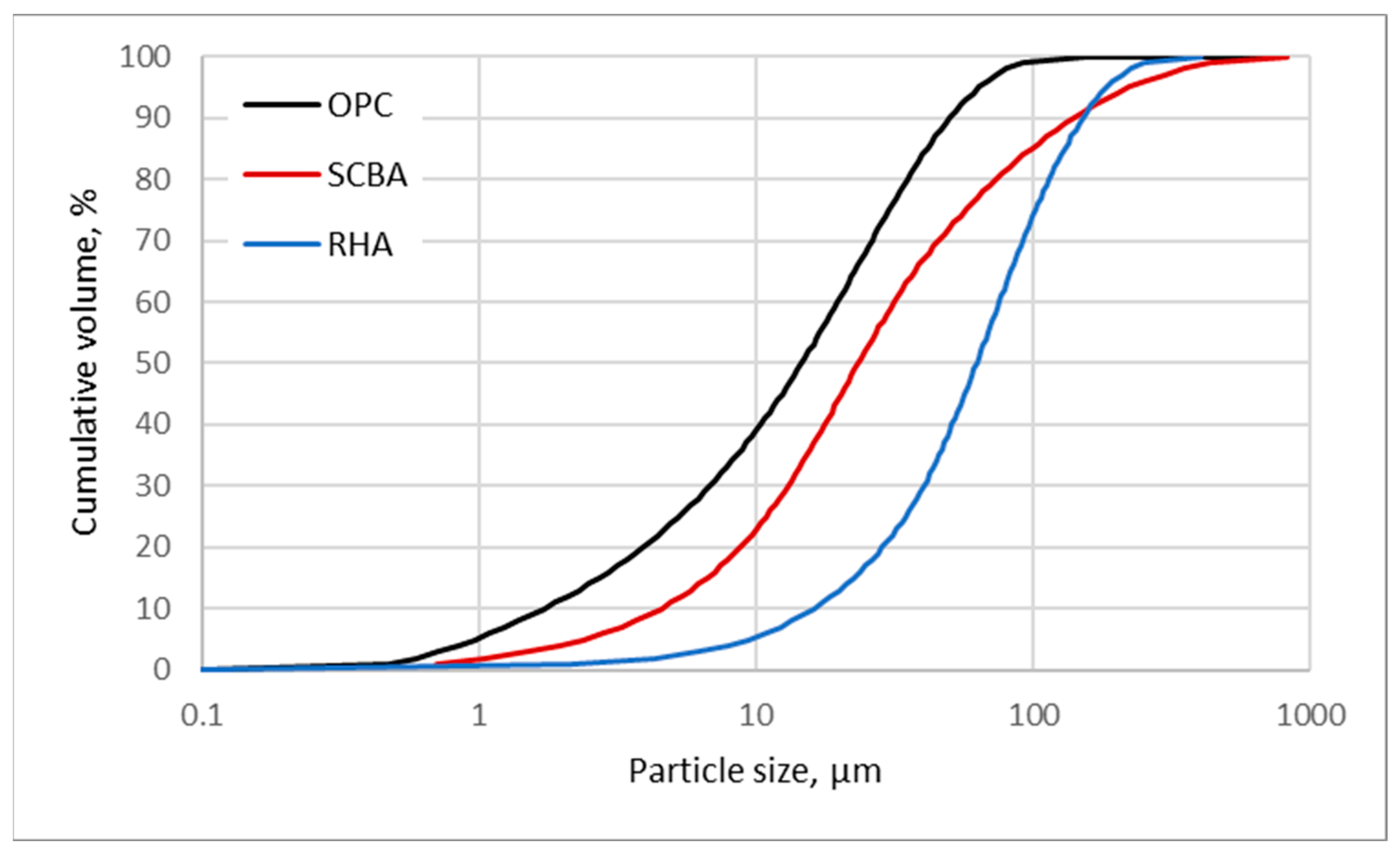 - Bui, D.D.; Hu, J.; Stroeven, P. Particle size effect on the strength of rice husk ash blended gap-graded Portland cement concrete. Cem. Concr. Compos. 2005, 27, 357–366. [Google Scholar] [CrossRef]