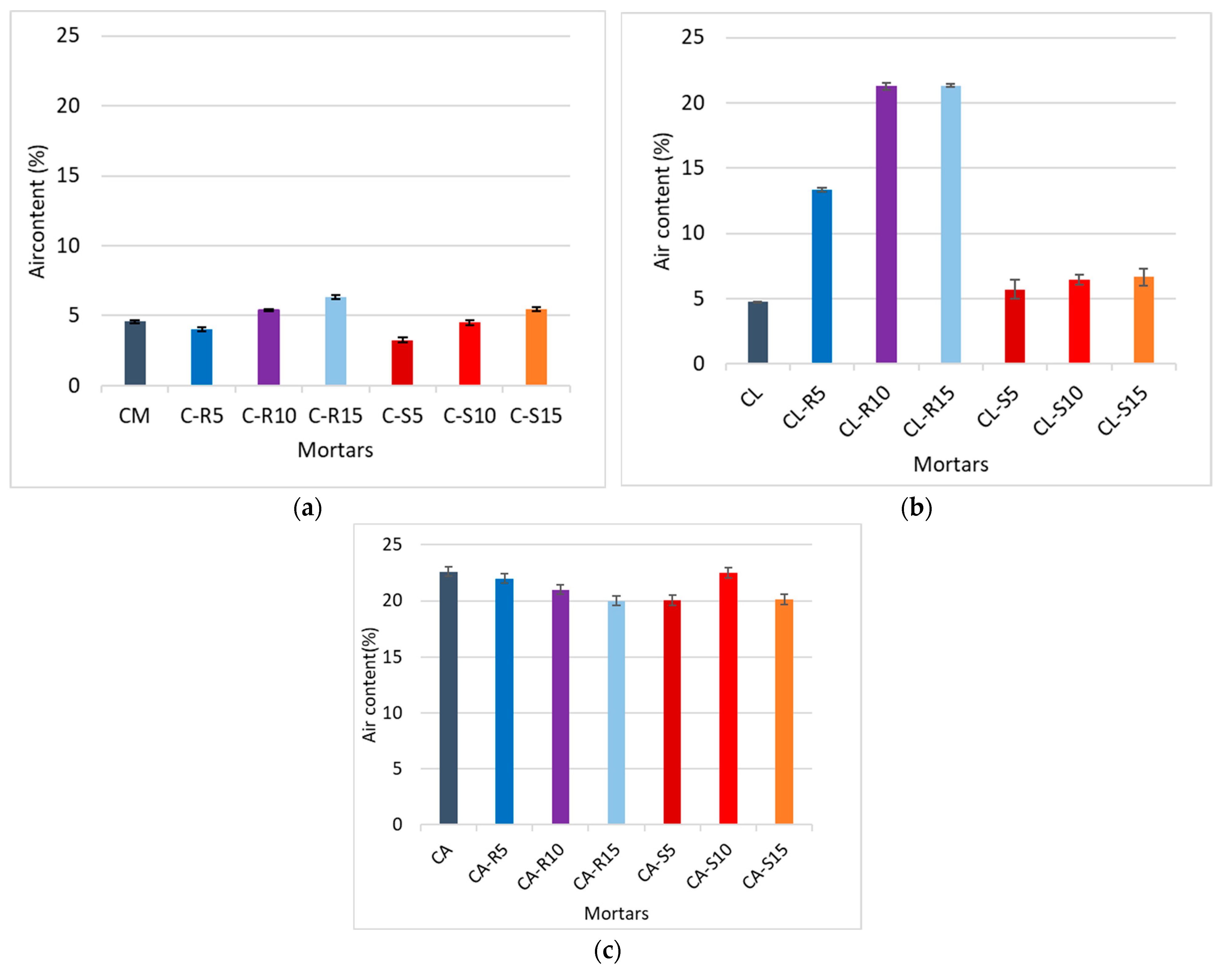 - Air content was affected to a small degree by the presence of SCBA and RHA, and the air content generally increased with the increase in SCM content. This may be due to the irregular shapes of the grains. In APA mortar samples, air voids arose due to the aerating effect of the admixture, and in this case no significant effect of the SCMs could be observed, possibly due to the large amount of air voids offsetting the issues caused by the shape of grains and changes in consistency.