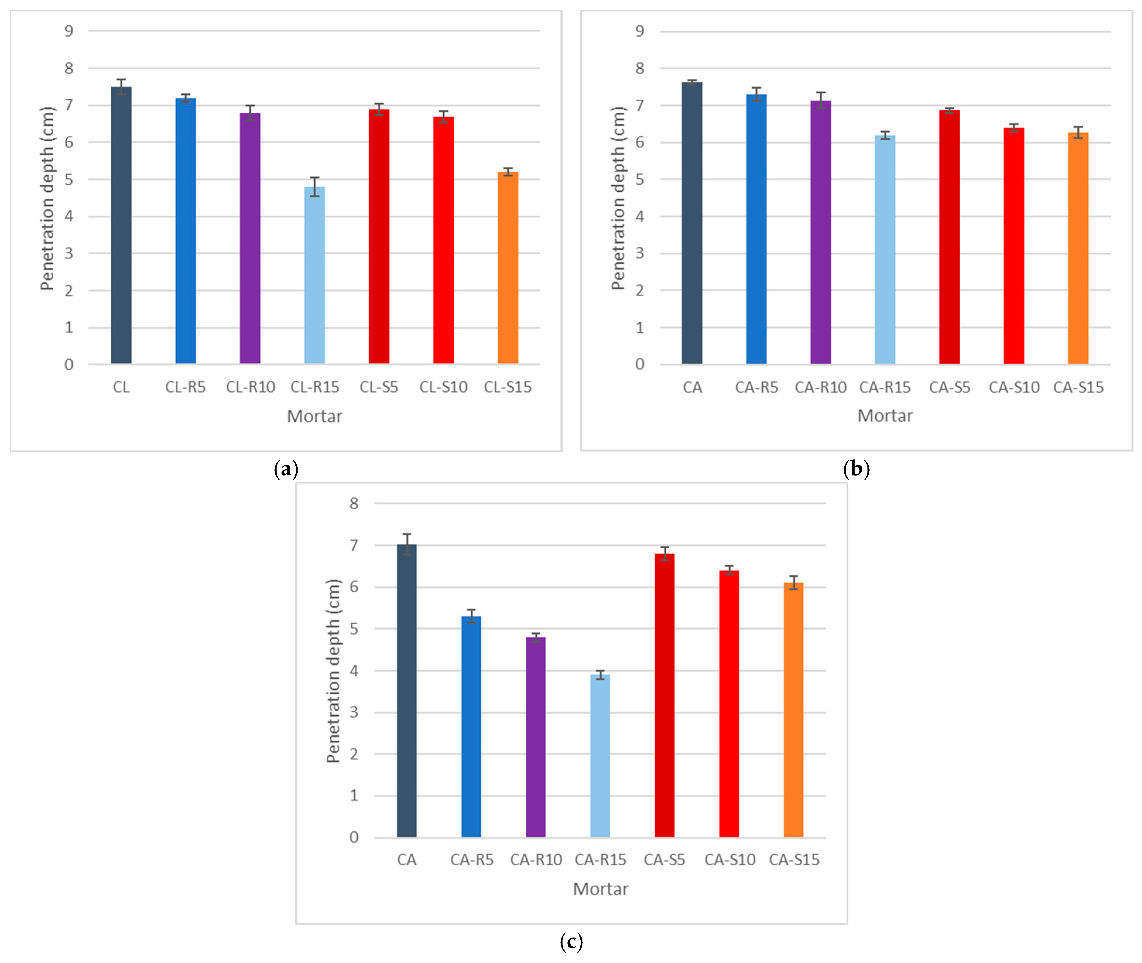 - The consistency by flow table analysis showed that replacement of 15% decreased the flow values of mixtures for both RHA and SCBA by 10% and 12% in cement mortar, 20% and 15% for cement–lime mortar, and 40% and 22% for APA cement mortar, respectively. Similar results were obtained for Novikov’s cone test. This effect may be linked to the fact that SCM addition increases the water demand on mixtures.