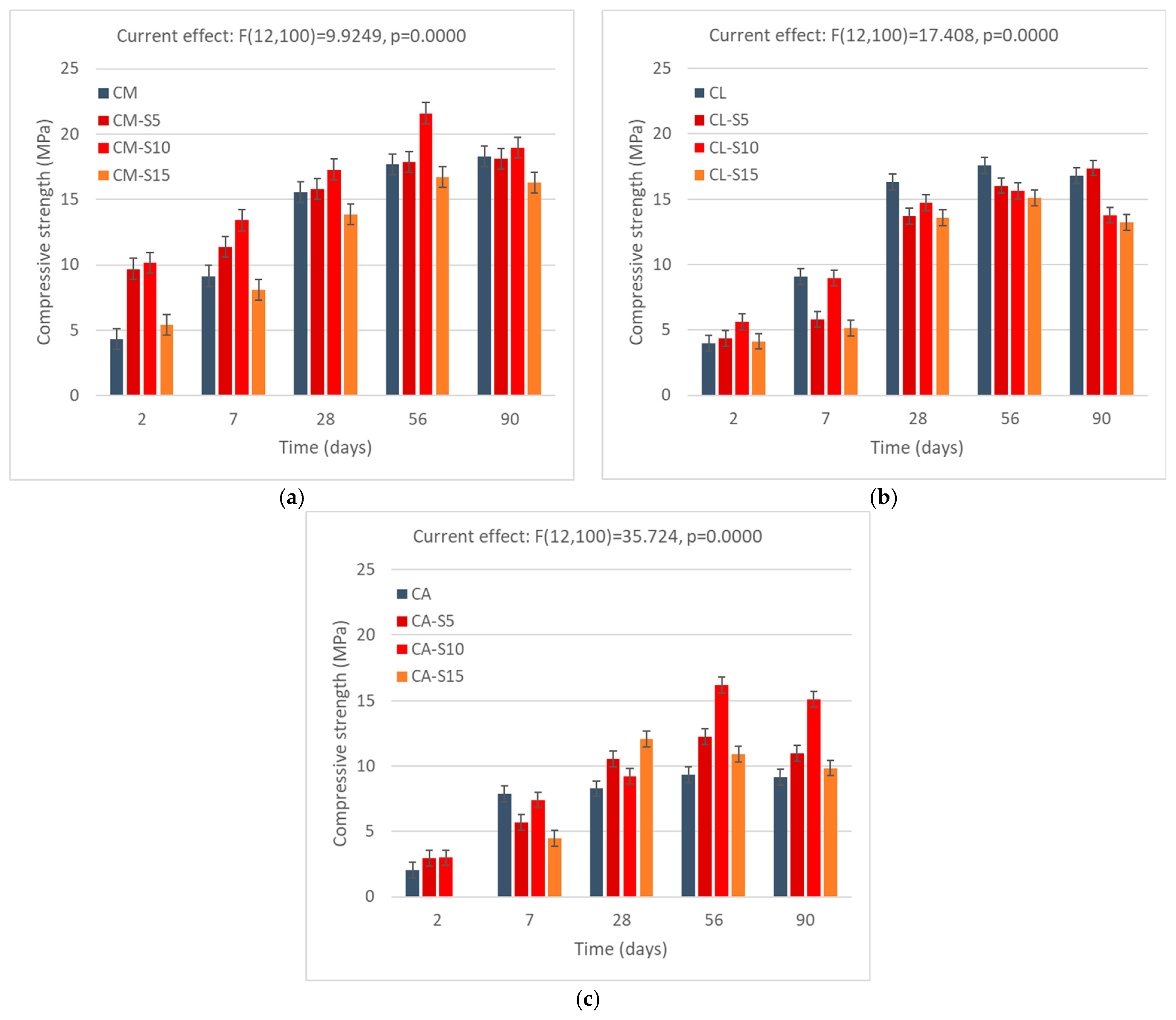 3.3.2. Compressive Strength of Mortars with SCBA Addition