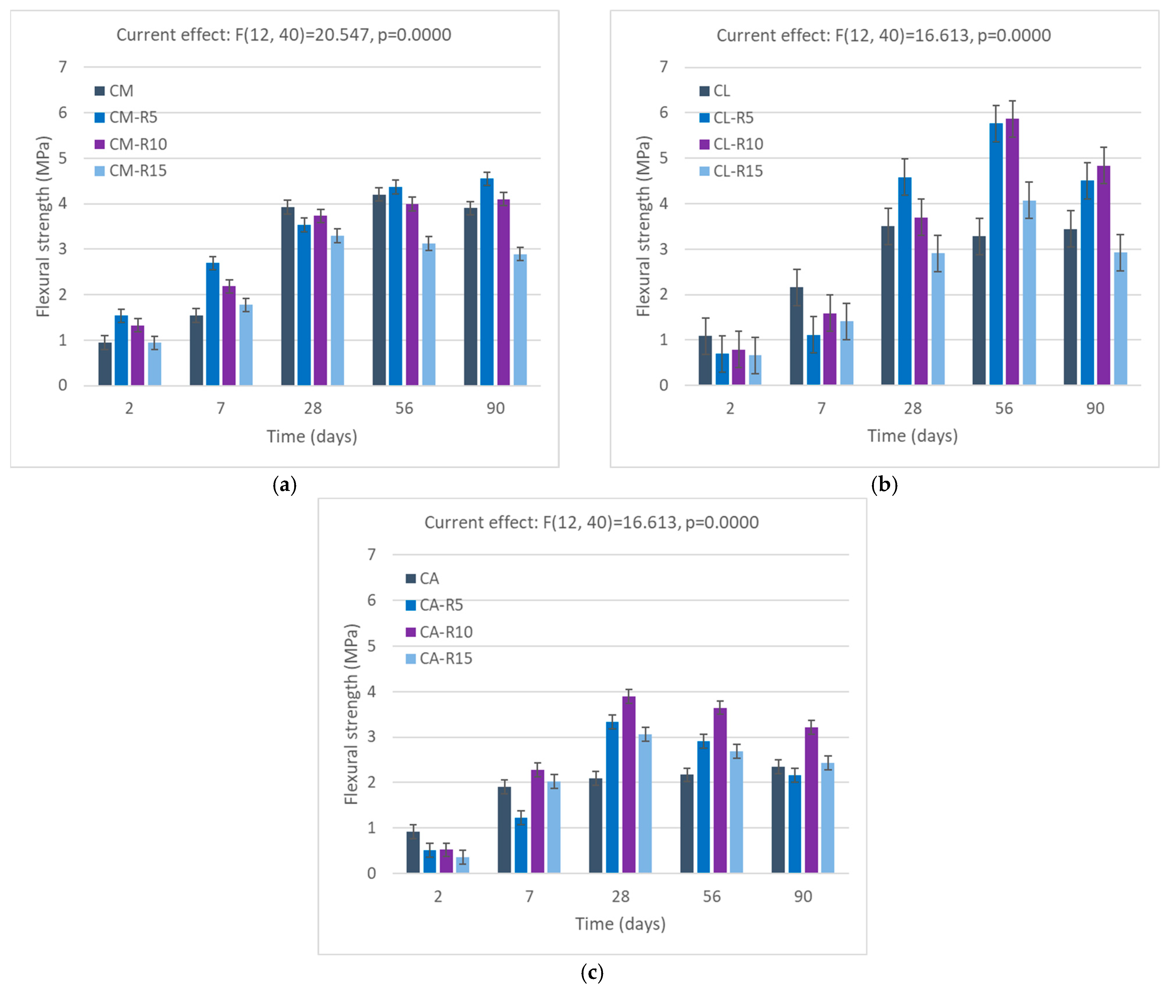 3.4.1. Flexural Strength of Mortars with RHA Addition