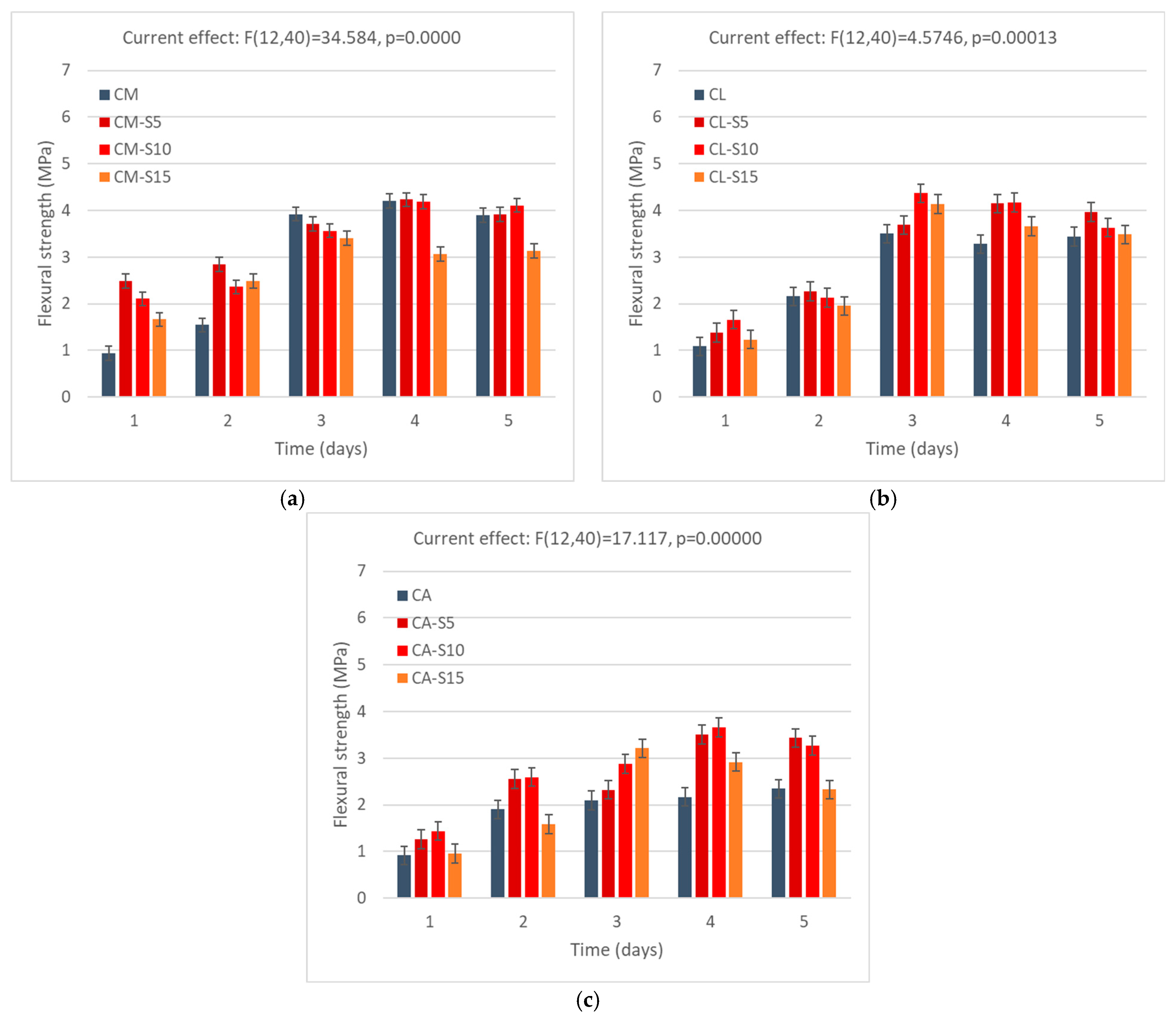 3.4.2. Flexural Strength of Mortars with SCBA Addition