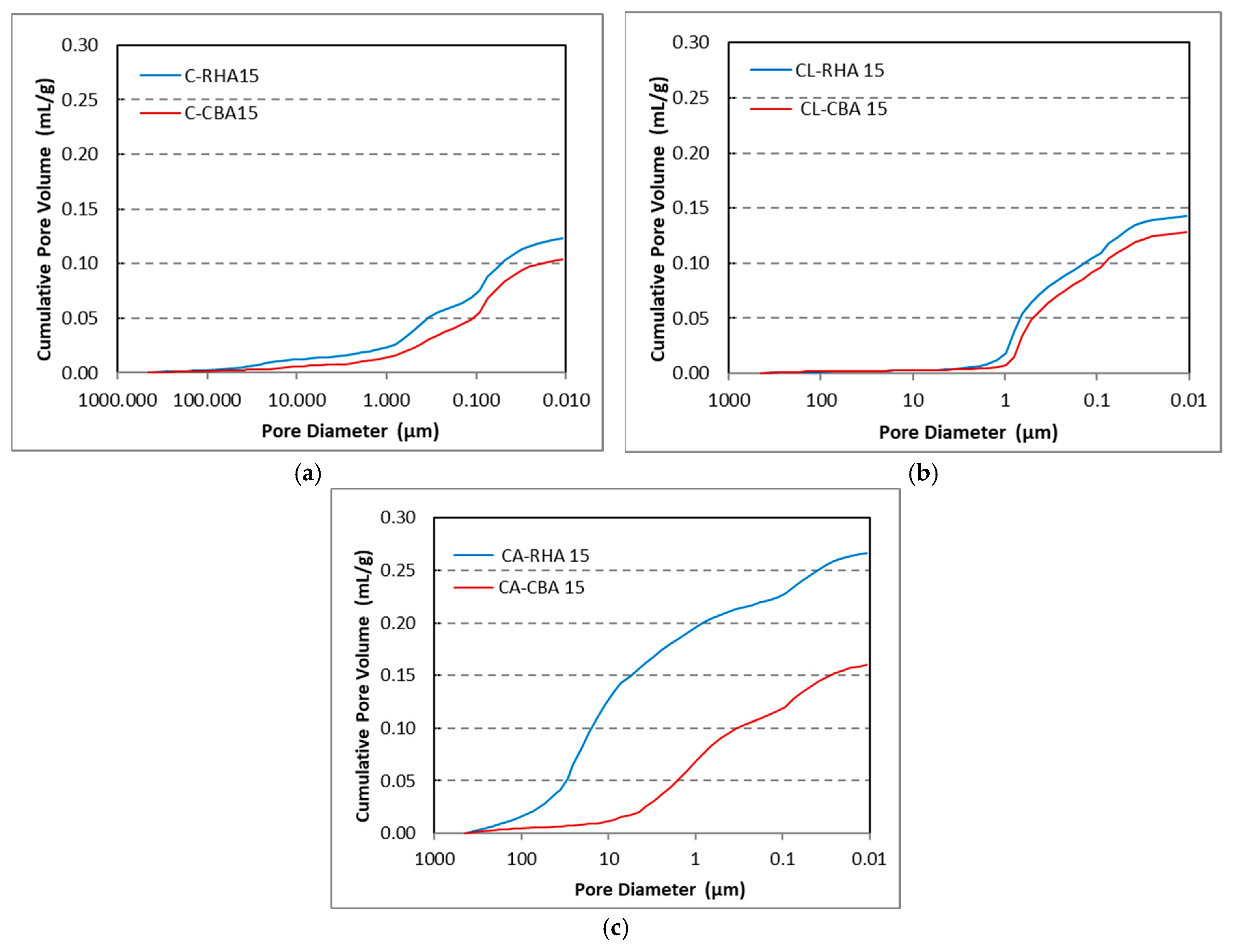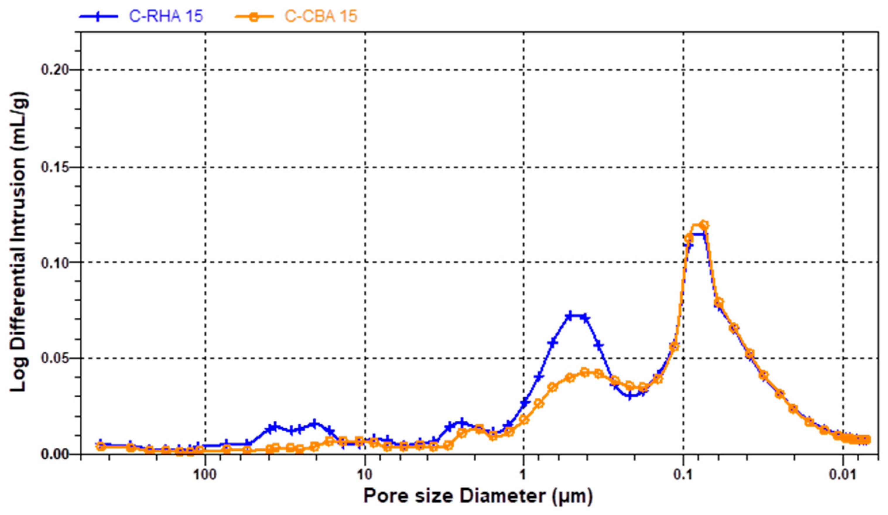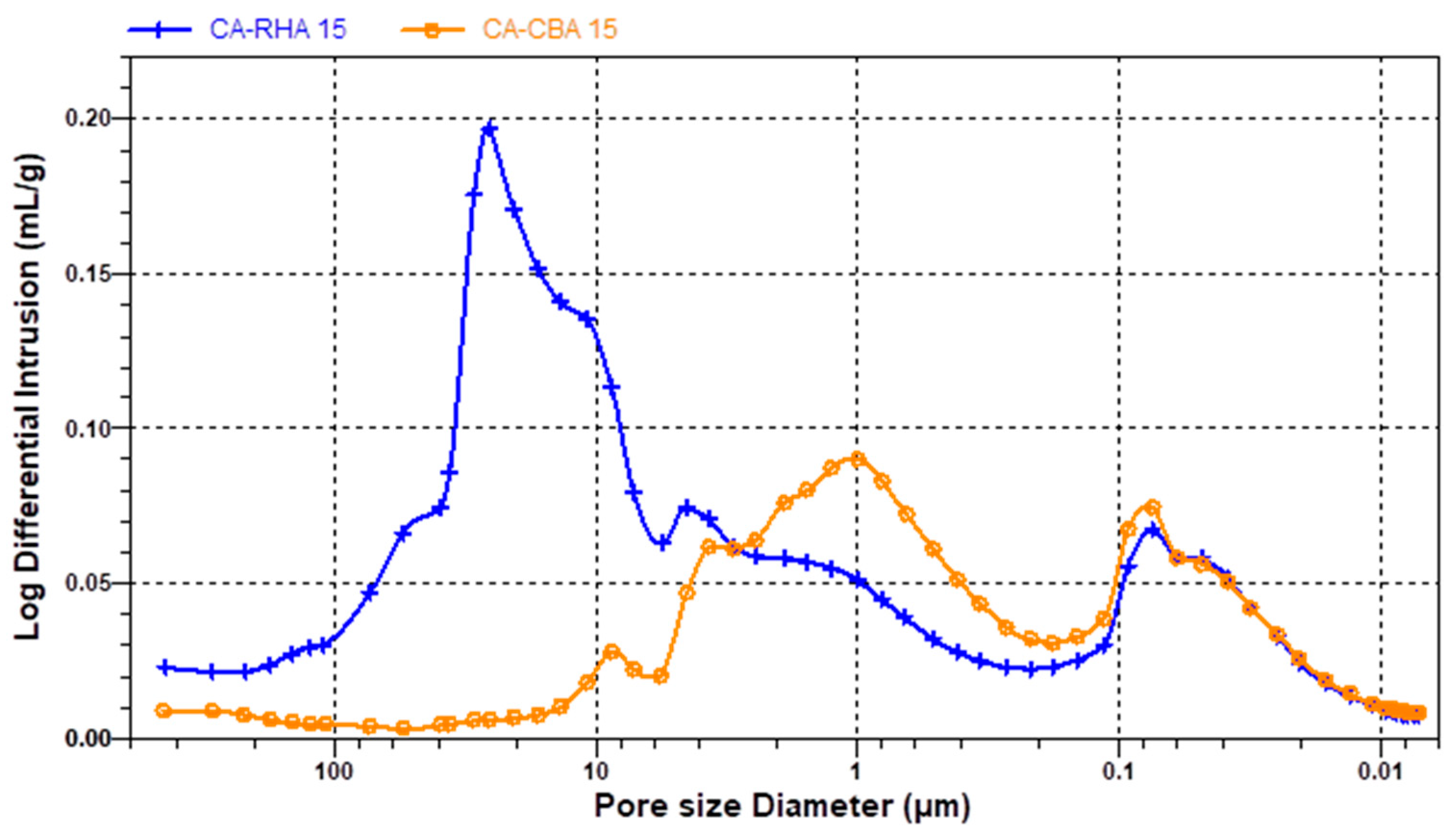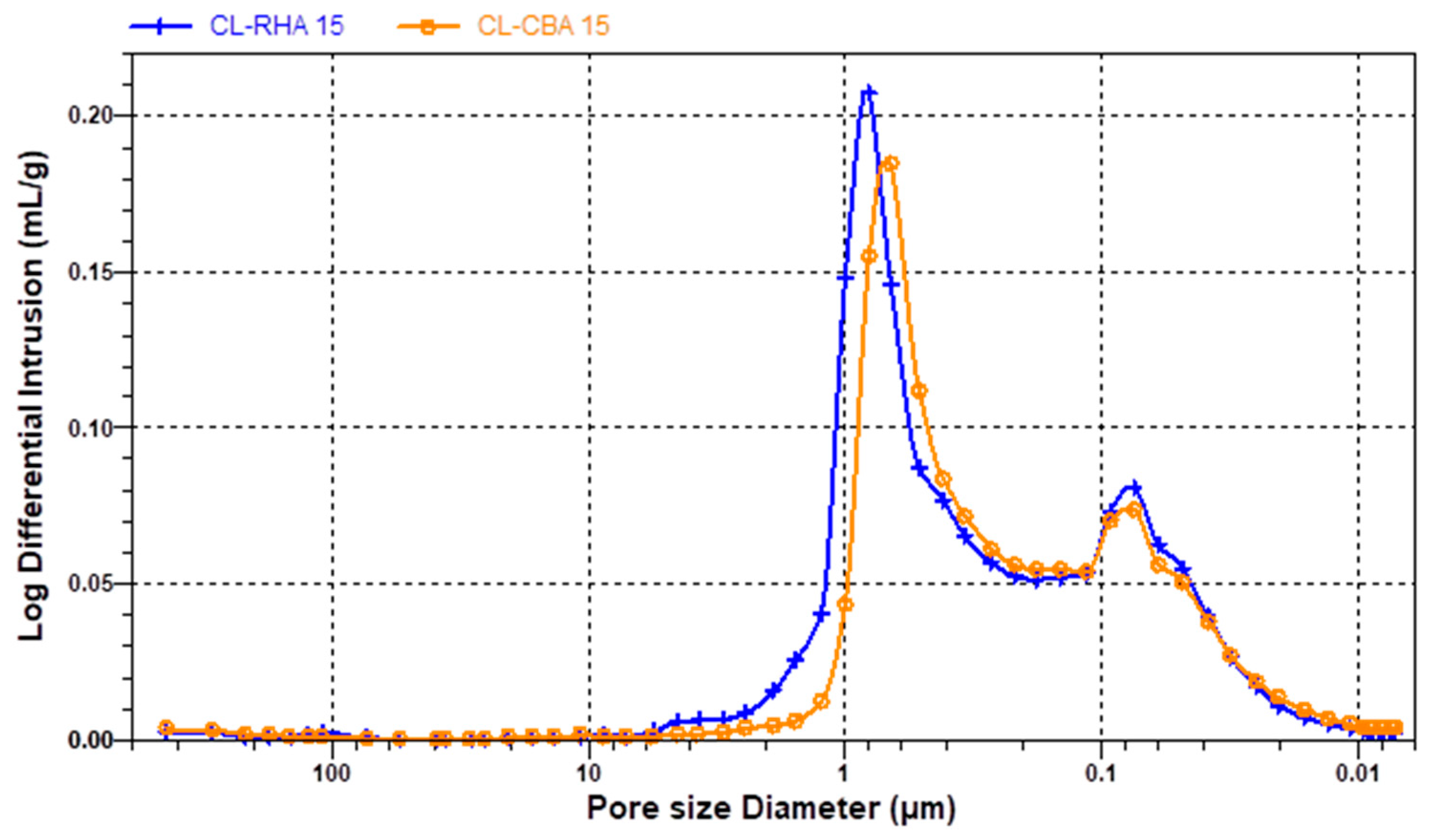 - Adding RHA increased the pore size (0.5–1 µm) in cement mortar and by a higher amount in cement–lime mortar in comparison to the SCBA additive. Additionally, APA increased the pore size (1–30 µm) in mortar with the RHA additive. MIP results indicated a greater share of pores with smaller diameters for the SCBA additive, which translated into higher strength results but also a tendency towards greater shrinkage in comparison with the RHA additive, possibly due to differences in the morphology of the ash particles.