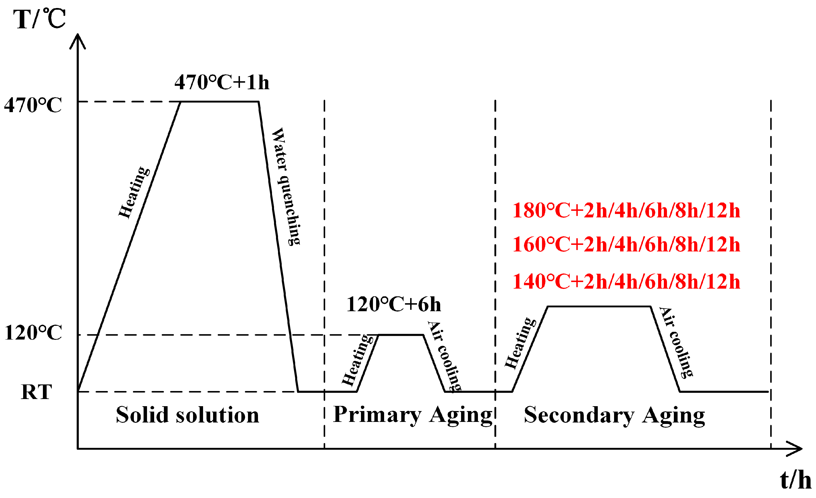 - Guo, J.; Su, R.; Li, G.; Qu, Y. Effect of secondary aging on microstructure and properties of cast Al–Cu–Mg–Ag alloy. Int. J. Met. 2024, 18, 2268–2282. [Google Scholar] [CrossRef]