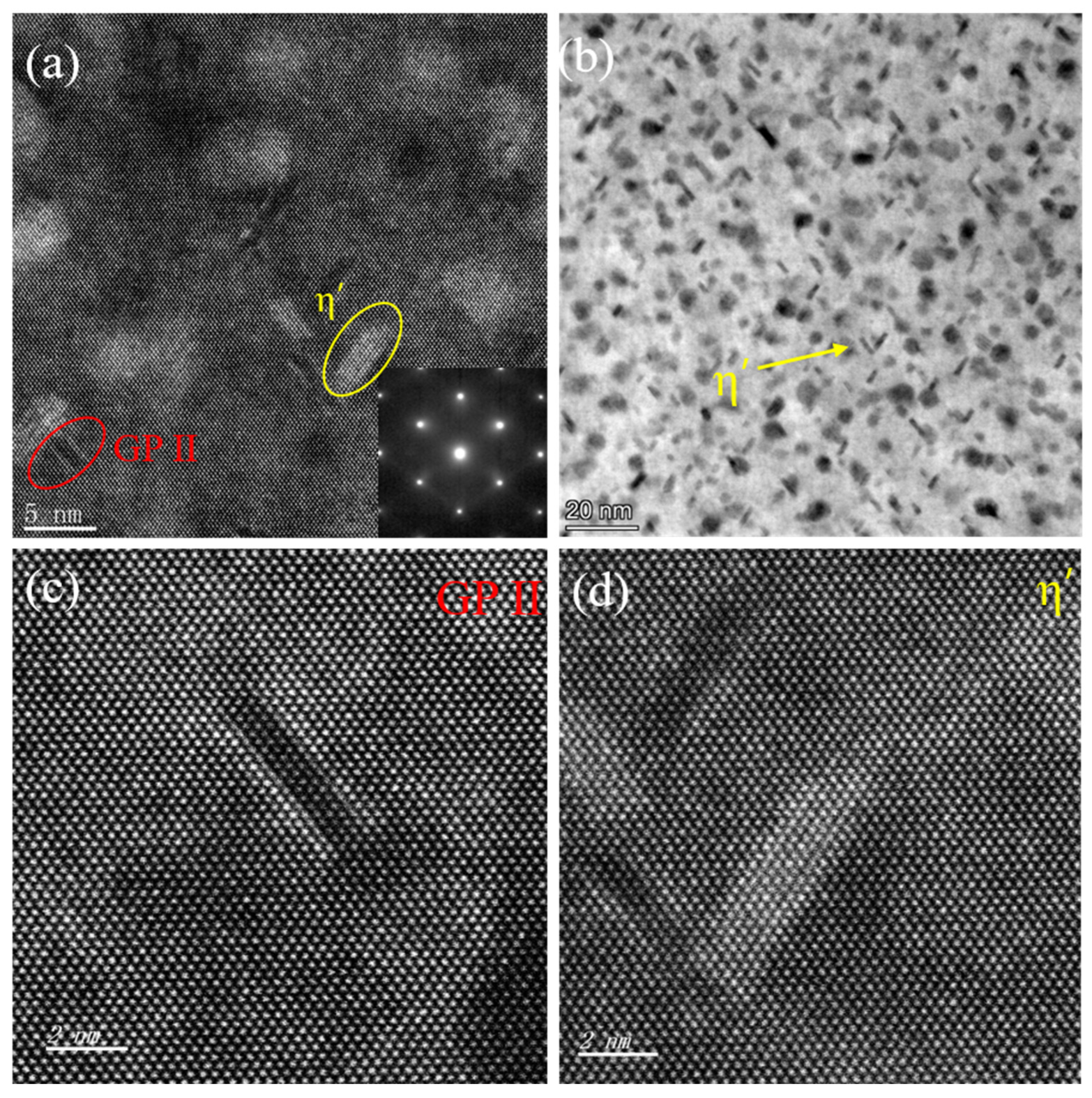 - Yang, W.; Ji, S.; Wang, M.; Li, Z. Precipitation behaviour of Al–Zn–Mg–Cu alloy and diffraction analysis from η′ precipitates in four variants. J. Alloys Compd. 2014, 610, 623–629. [Google Scholar] [CrossRef]