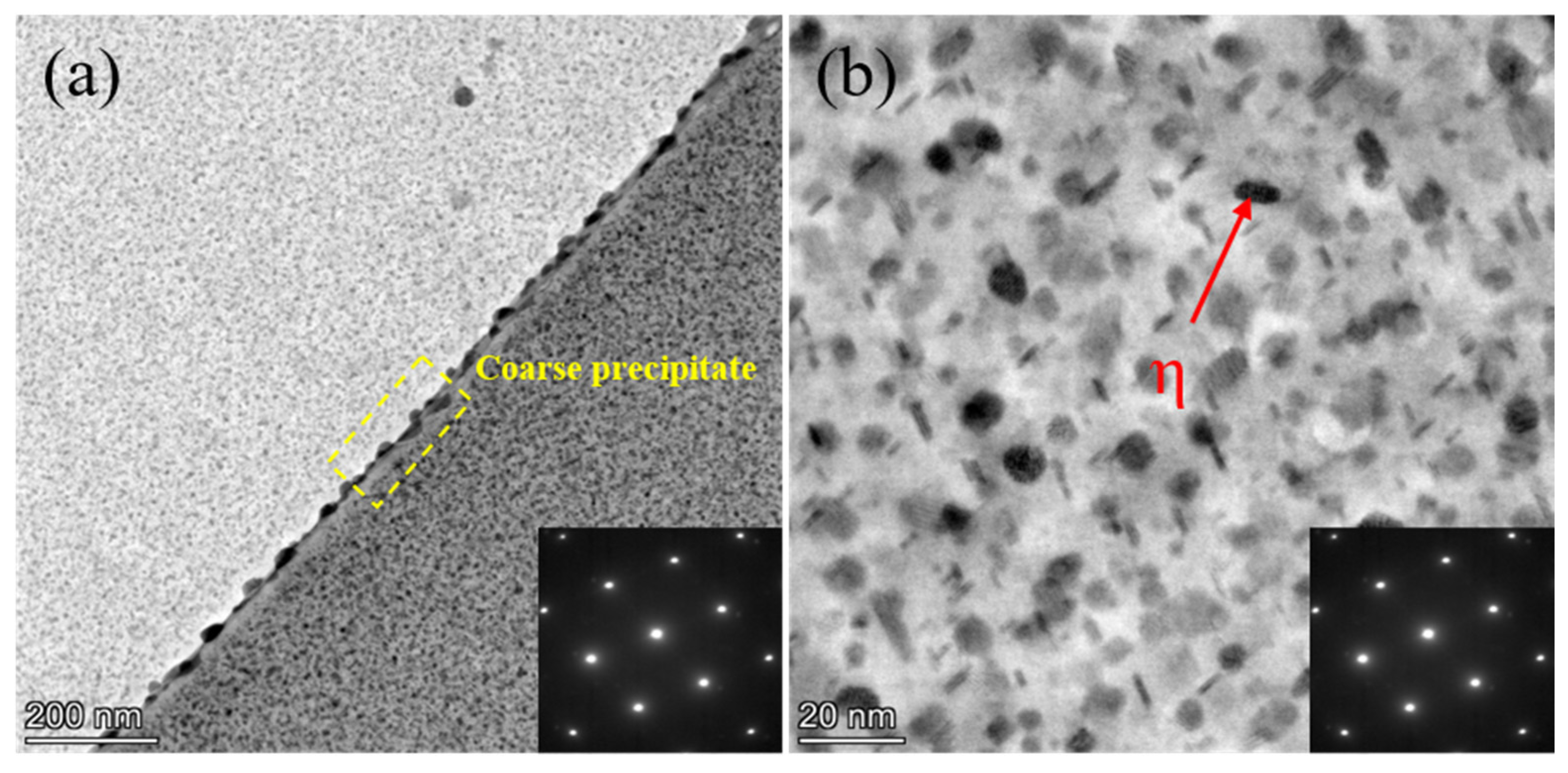 - After the two-step aging treatment, the precipitates primarily consisted of the metastable η′ phase and the equilibrium η phase, with a relatively uniform distribution. Precipitate strengthening is the primary mechanism for strengthening the alloy, and a precipitation-free zone (PFZ) is clearly observed at the grain boundaries. Additionally, it was found that increasing the secondary aging temperature shortened the time required for the alloy to reach the peak-aging plateau.