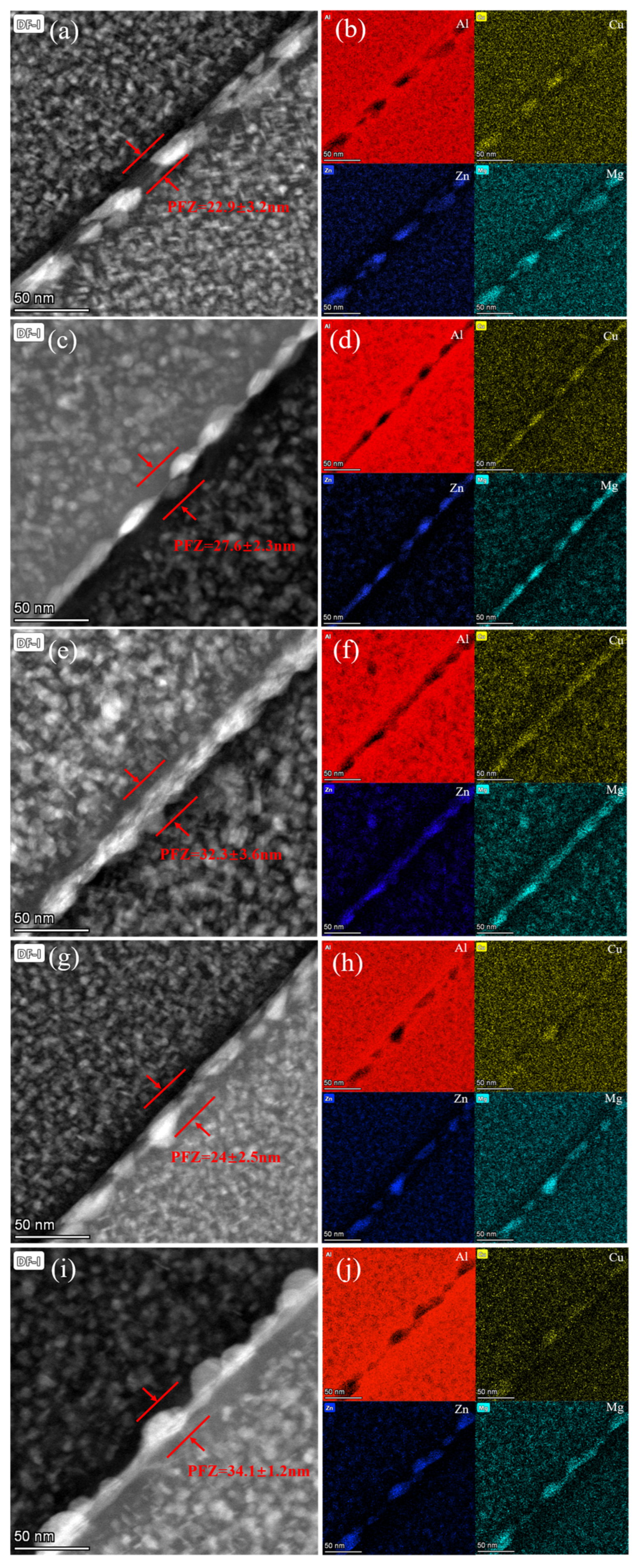 - A relatively short secondary aging time can result in the metastable η′ strengthening phase not having enough time to nucleate and grow, leading to a less pronounced aging strengthening effect. On the other hand, excessive prolongation of the secondary aging time results in the formation of a large number of equilibrium η phases. The larger size of the equilibrium η phase not only fails to strengthen the alloy but also consumes a large amount of zinc and magnesium, restricting the precipitation of the η′ phase during aging. Additionally, the widening of the PFZ around the coarse equilibrium η phases further reduces the mechanical properties of the alloy.