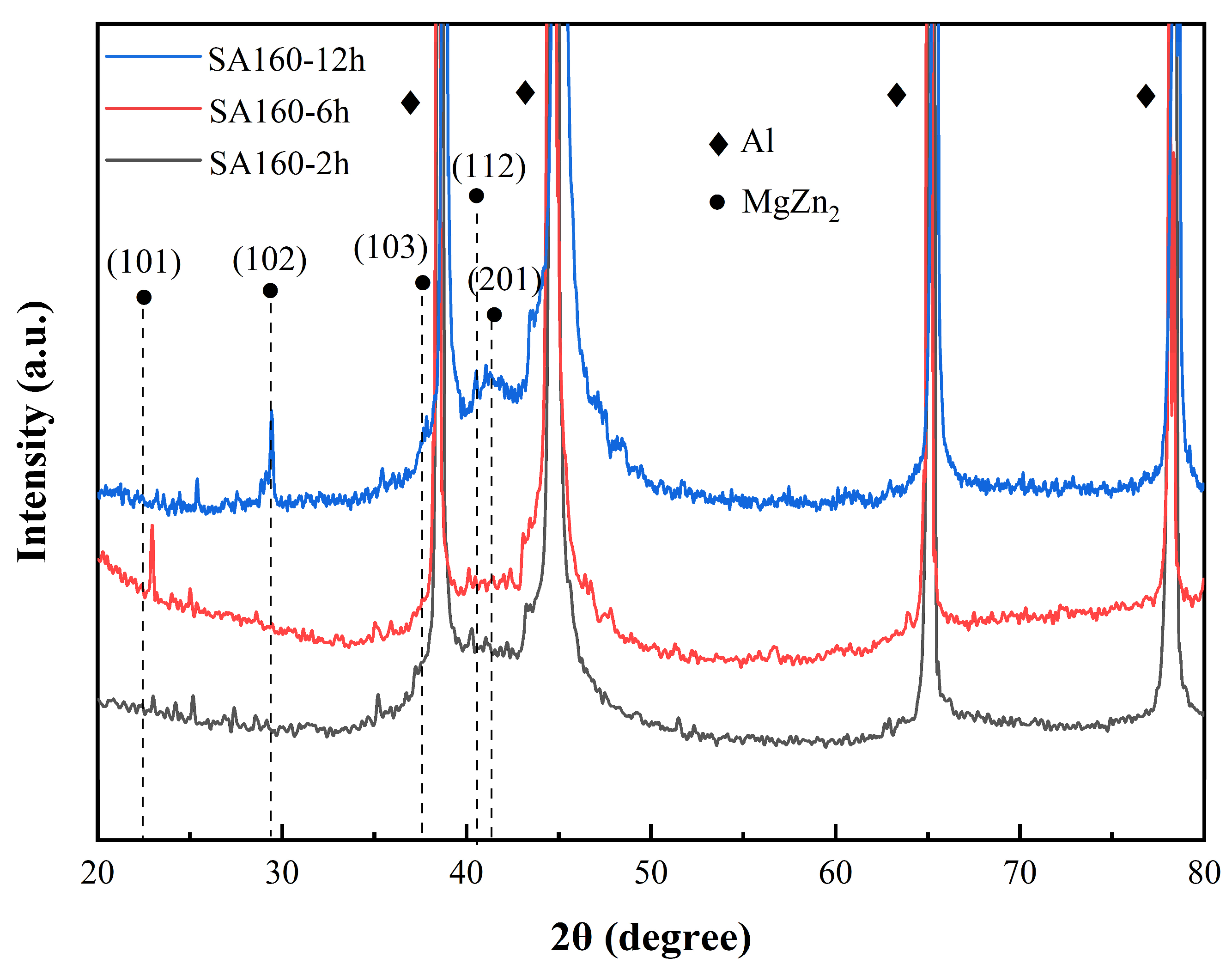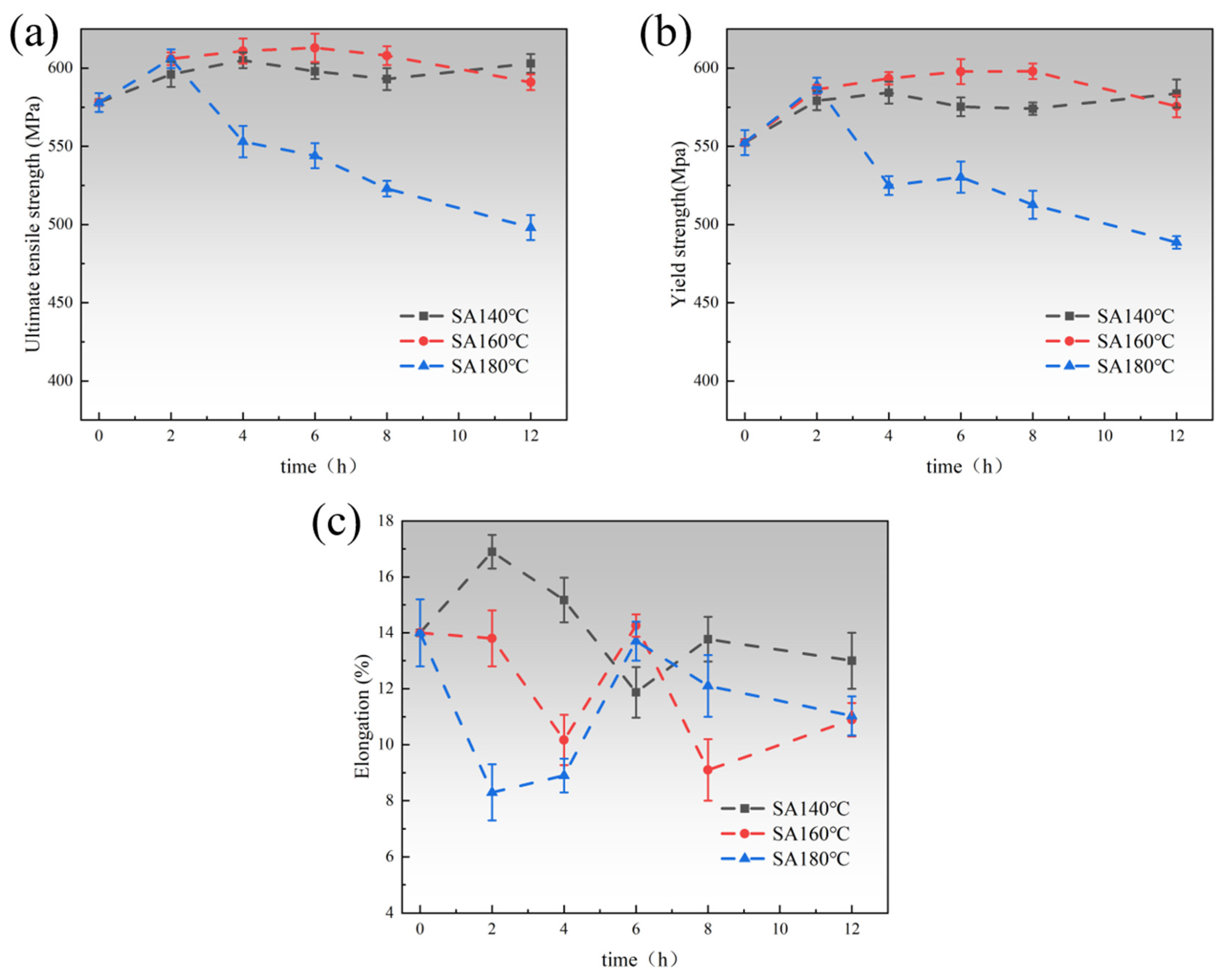 - Under the regulation of secondary aging temperatures (140 °C, 160 °C, 180 °C), the samples subjected to peak-aging at 160 °C exhibited the optimal overall performance (tensile strength of 613 MPa, yield strength of 589 MPa, and elongation of 14.26%). Additionally, it was observed that with the extension of aging time, the longest duration of the peak plateau period was 6 h at 160 °C, and elongation increased slightly during this period. This indicates that appropriately extending the secondary aging time at this temperature can enhance the plasticity and toughness of the material without a loss in strength.