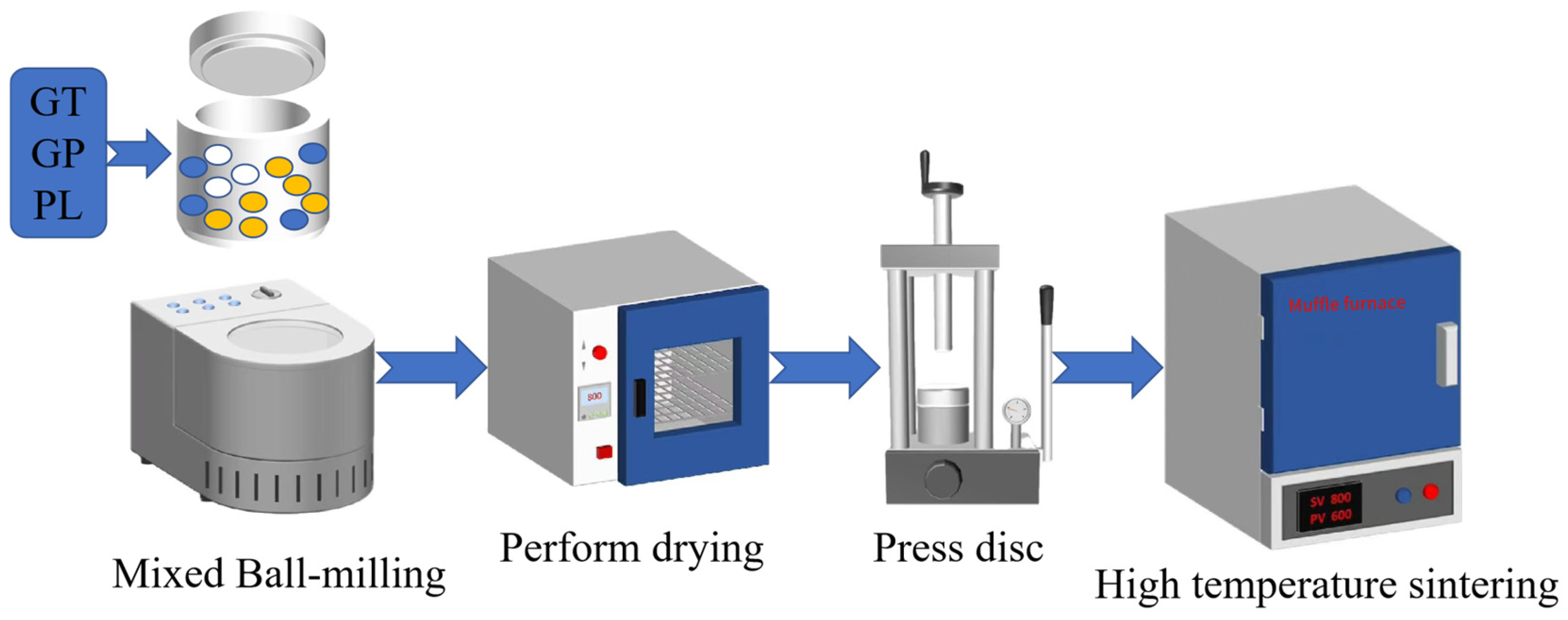 21]. The particle size of raw materials also affects the microstructure of the porous ceramics. Based on the proportions of raw materials in the A1 sample, the gold tailings, replaced with untreated raw gold tailings and gold tailings milled by dry ball milling for 120 min, while the silicon carbide foaming agents were as well as replaced with different particle sizes, named SiC1# and SiC2#. The other raw materials remained the same, and the new samples were numbered B1, B2, B3, and B4, as detailed in