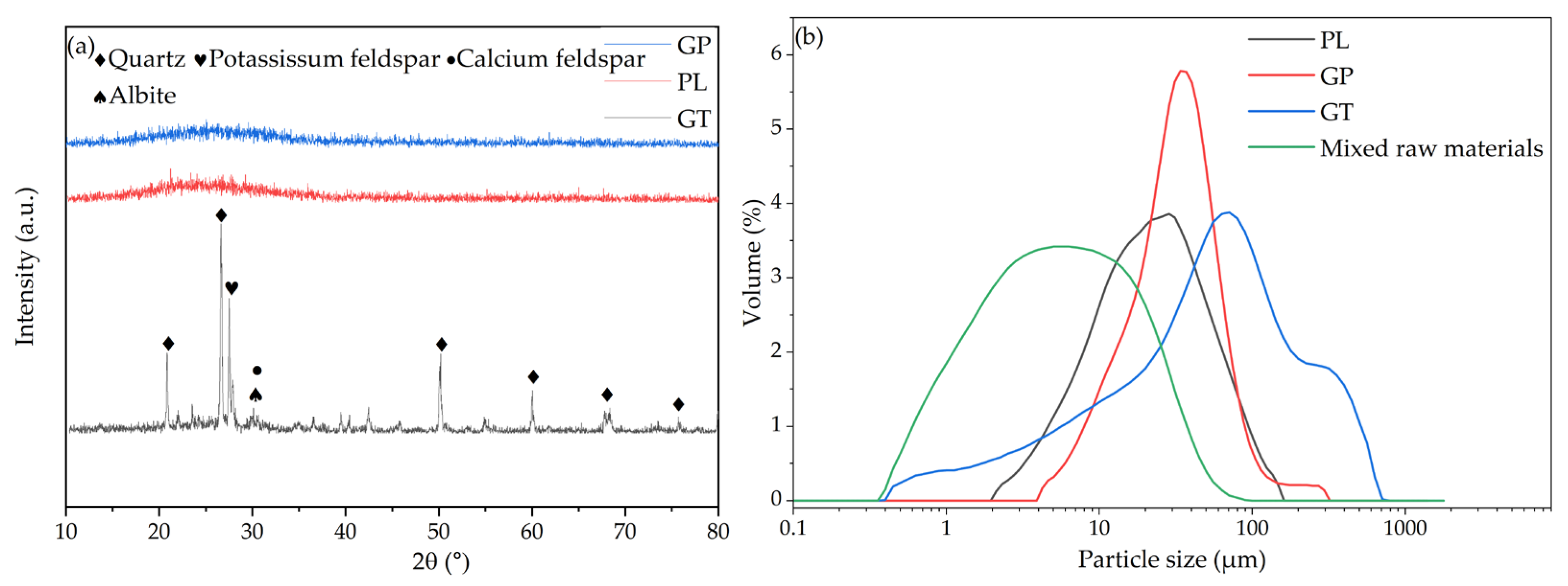 The aforementioned results have identified the formulation with 50 wt.% gold tailings (GT) sintered at 1050 °C (Sample A1) as a promising base composition. To further optimize the microstructure, specifically to achieve higher porosity and a finer, more uniform pore structure, we investigated the effect of raw material particle size on this optimized base formulation. The GT and silicon carbide (SiC) foaming agent were selected as the key variables for this subsequent stage of process refinement. The particle size distribution of each raw material was measured using a Hydro-2000SM (A) laser particle size analyzer (Malvern Panalytical, UK), and the results were presented in