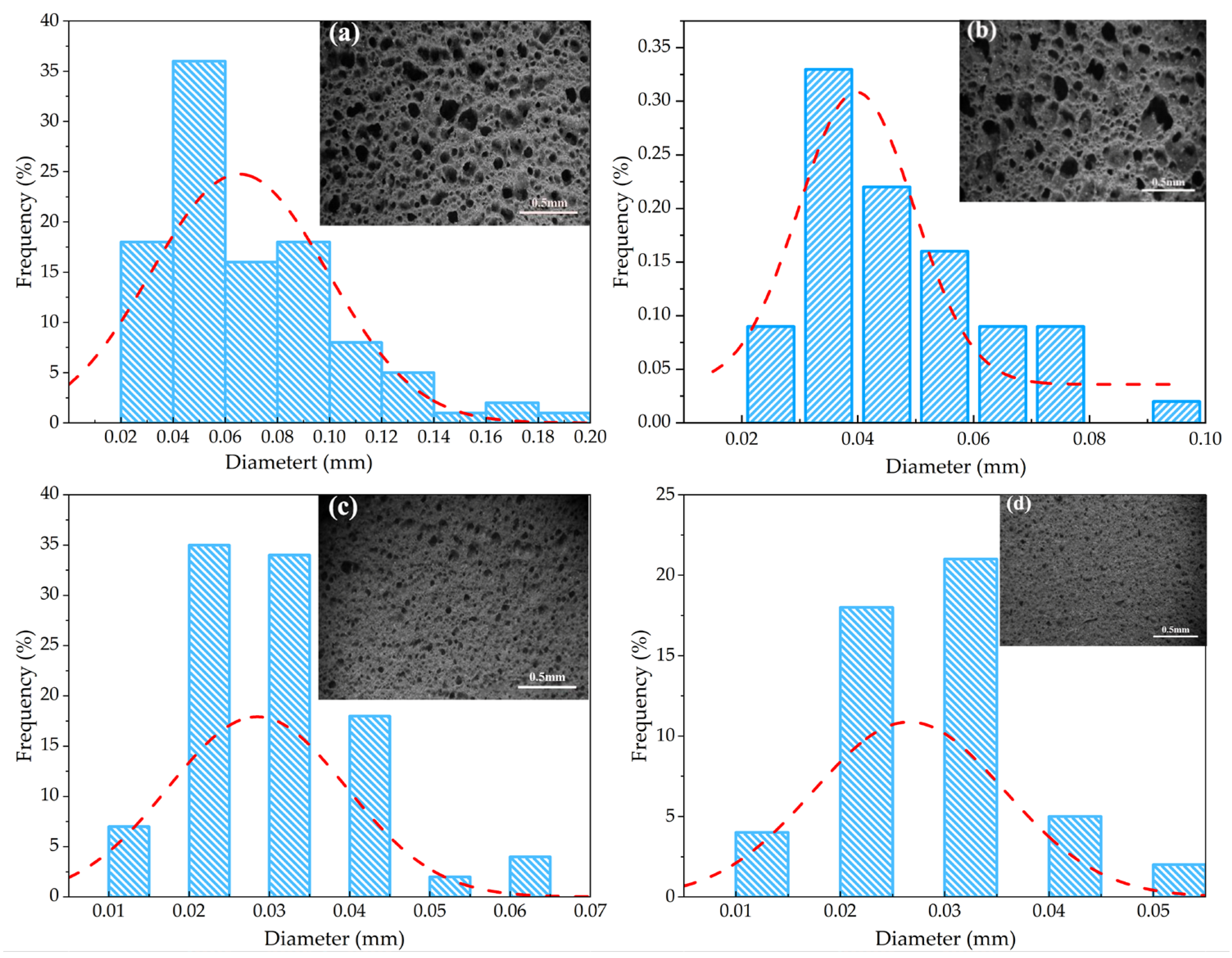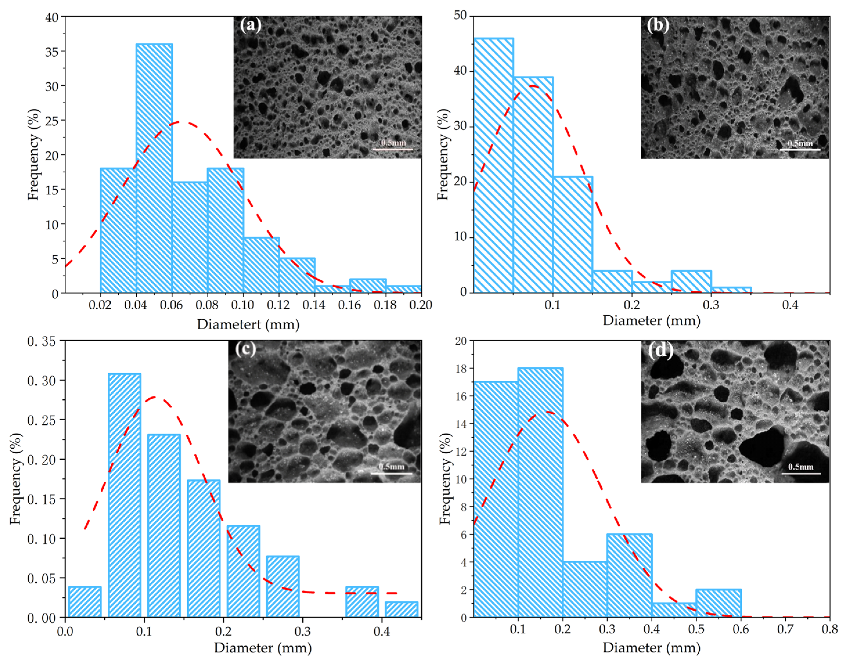 Figure 5 presents the microstructure images and pore size distribution of the porous ceramic samples. As illustrated in the figure, with the increase in GT content, the pore size of the samples decreased significantly, from 0.162 mm to 0.023 mm. Moreover, the Gaussian fitting results of the pore size distribution exhibit obvious differences among samples with varying GT contents this directly indicates that GT content exerts a prominent regulatory effect on the pore size of the porous ceramics, and the optimal GT content was determined to be 50%. From the perspective of raw material composition and sintering mechanism, the key components SiO