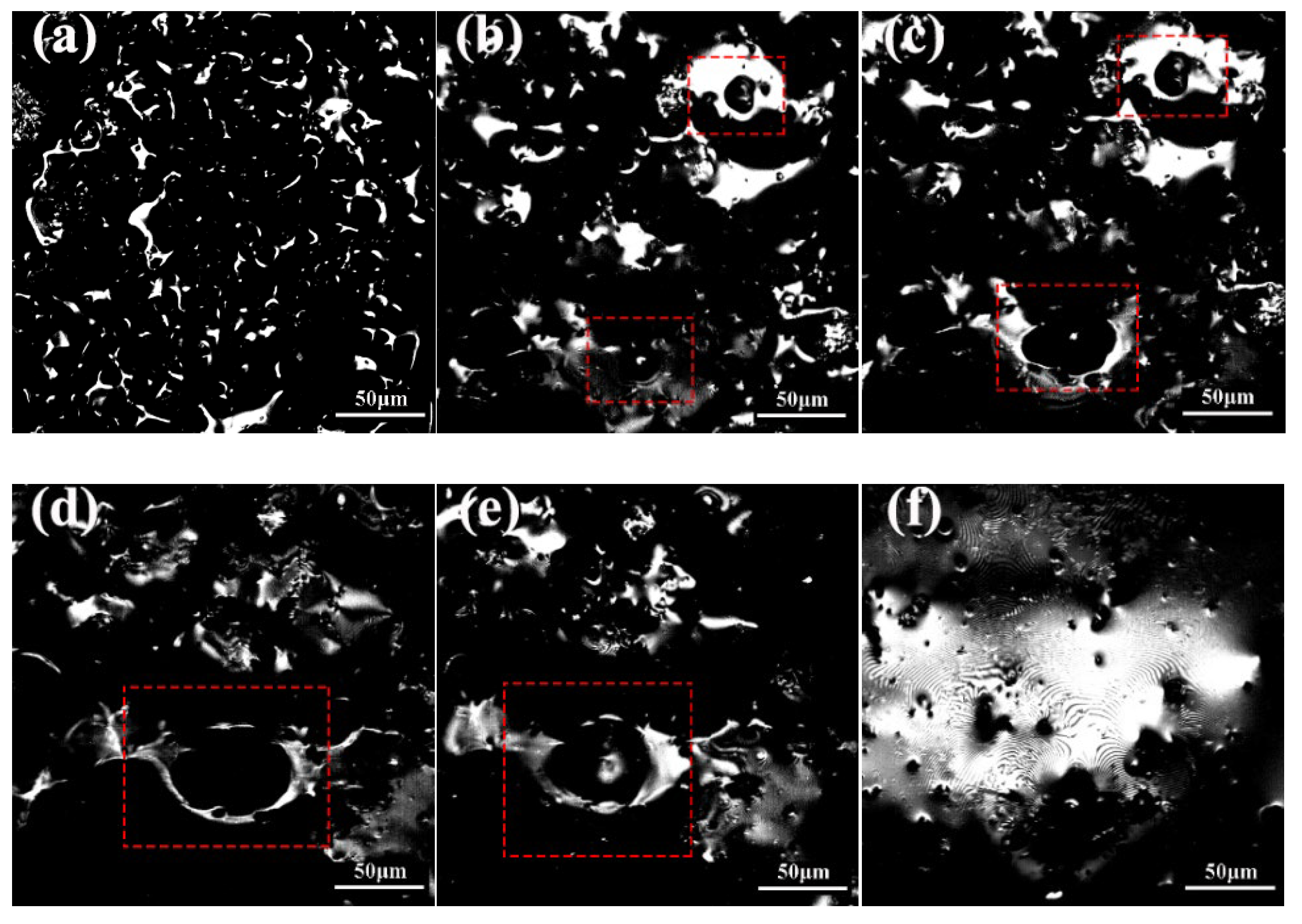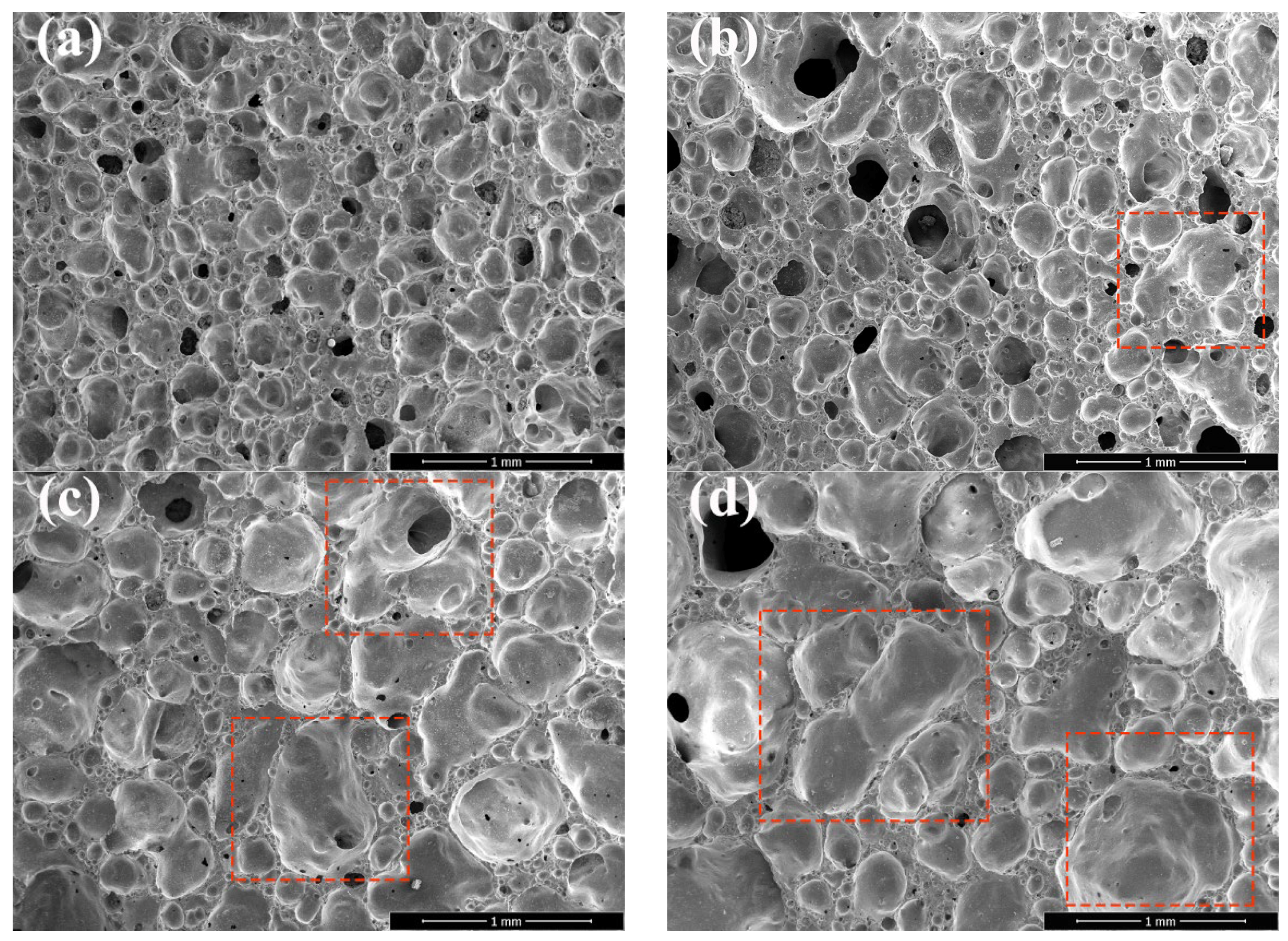 Figure 10d, more gas elevated internal bubble pressure. When this pressure exceeded the surface tension of the ceramic matrix’s molten phase, bubbles ruptured and merged with adjacent bubbles highlighted by red boxes in