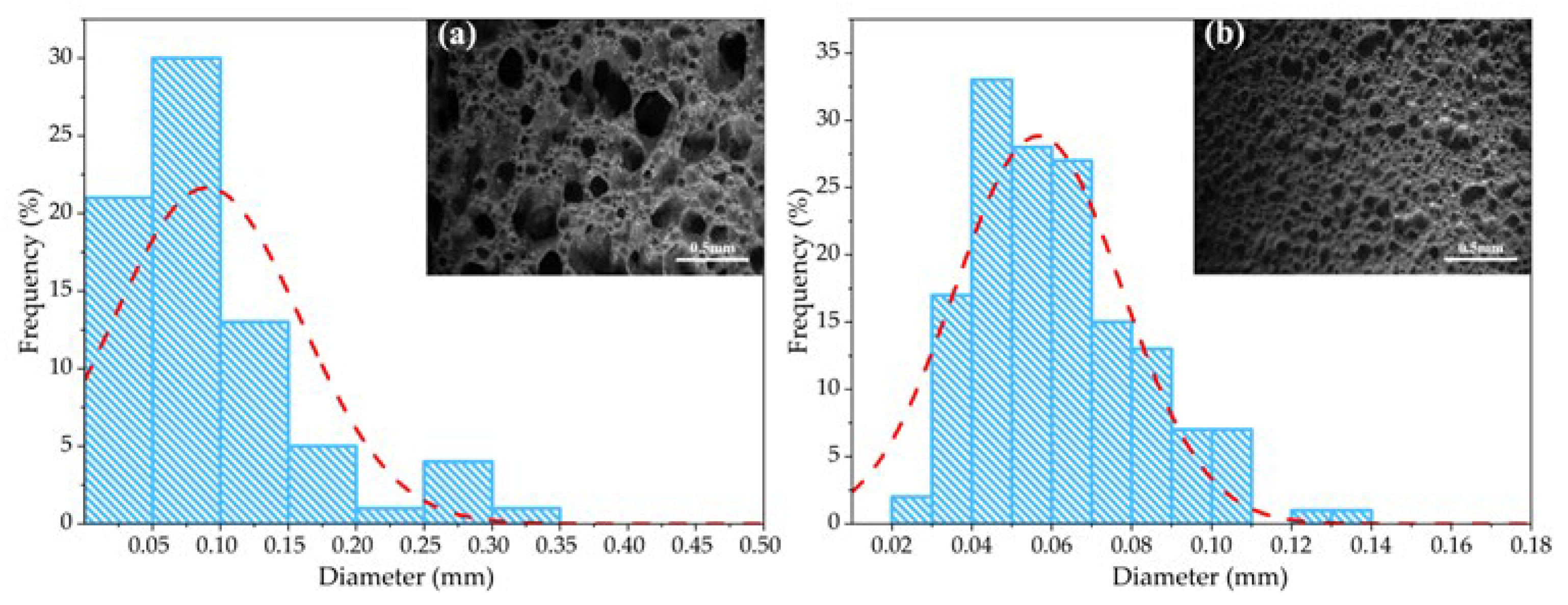 Figure 10a, the generated gas was insufficient to support full pore growth, resulting in smaller pore sizes and relatively higher bulk density. As SiC content increased 0.20 wt.% in
