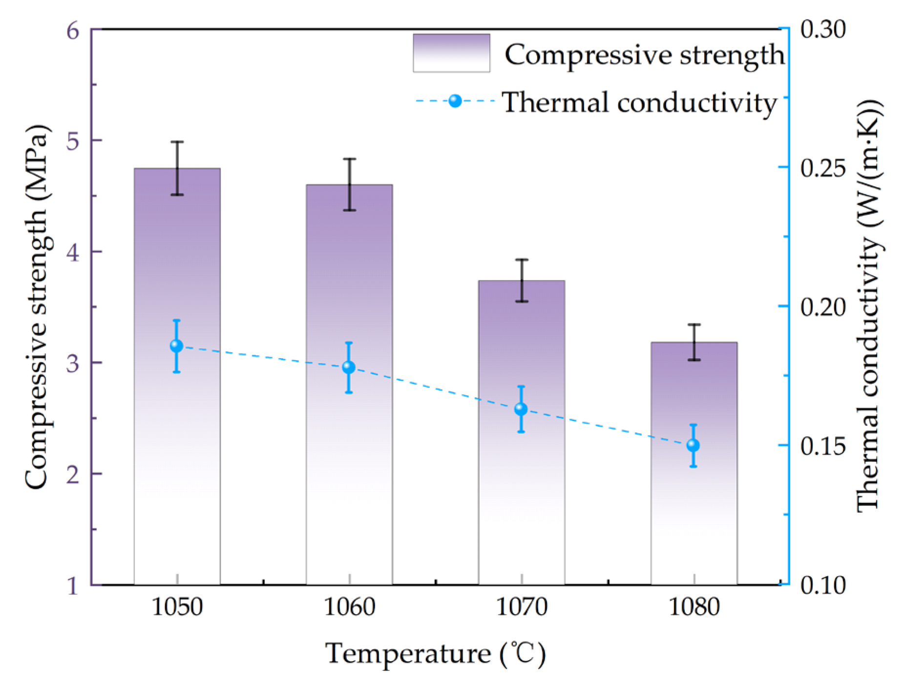 Figure 13. As the temperature increased from 1050 °C to 1080 °C, the compressive strength of the material was decreased from 4.75 MPa to 3.25 MPa with the decrease of approximately 32%. The thermal conductivity was decreased from 0.18 W/(m·K) to 0.15 W/(m·K). The compressive strength meets the requirements of GB/T 16533-1996 [