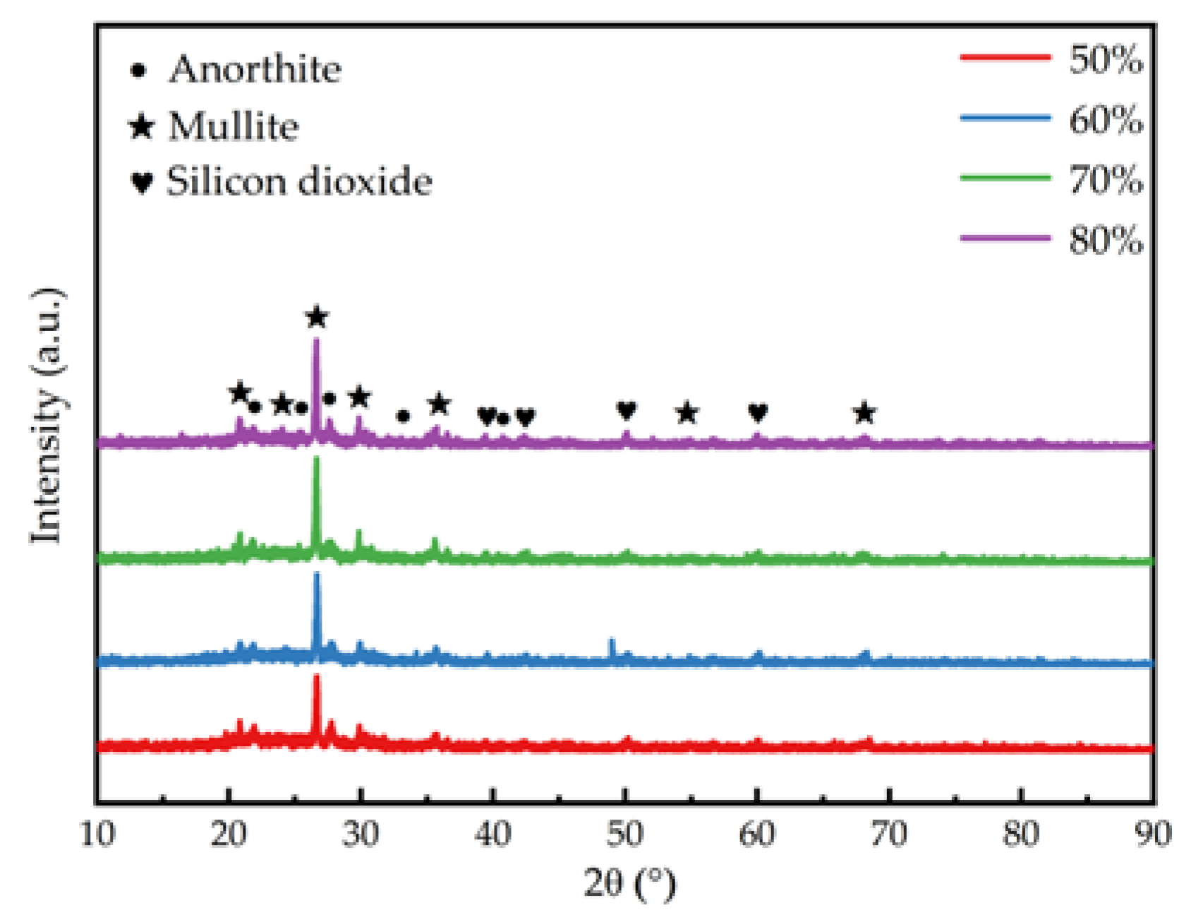 Figure 11, with the increase in the amount of gold tailings, the compressive strength of porous ceramics increased from 4.62 MPa to 7.18 MPa, and the thermal conductivity increased from 0.186 W/(m·K) to 0.32 W/(m·K). The enhancement of the compressive strength came from the reduced pore size and porosity of the materials with the increase in the amount of gold tailings as shown in