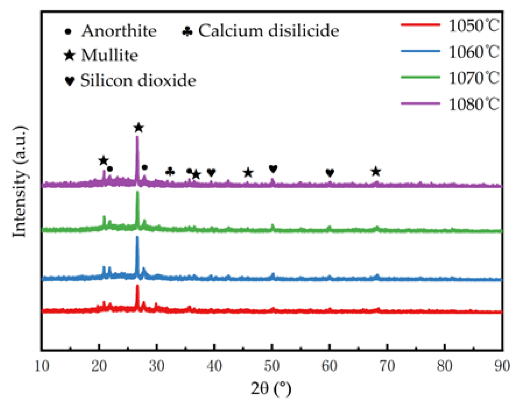 Figure 6f), at 1090 °C, the porosity structure completely disappeared, Gold tailings based porous ceramics undergoes severe melting at 1090 °C: Viscosity plummets:Melt viscosity is critical for sustaining bubble structure higher viscosity “traps” bubbles. At 1090 °C, low viscosity fails to restrain bubble growth/merging. The decrease in surface tension weakens the melt’s ability to maintain discrete bubble interfaces, making bubble rupture and coalescence easier. Thus, even without excessive gas generation, the melt’s physical stability, governed by viscosity and surface tension, collapses at 1090 °C, further promoting pore interconnection. This confirms that the entire decomposition reaction of silicon carbide has been completed and that the foaming process has reached its terminal state with no further gas generation.