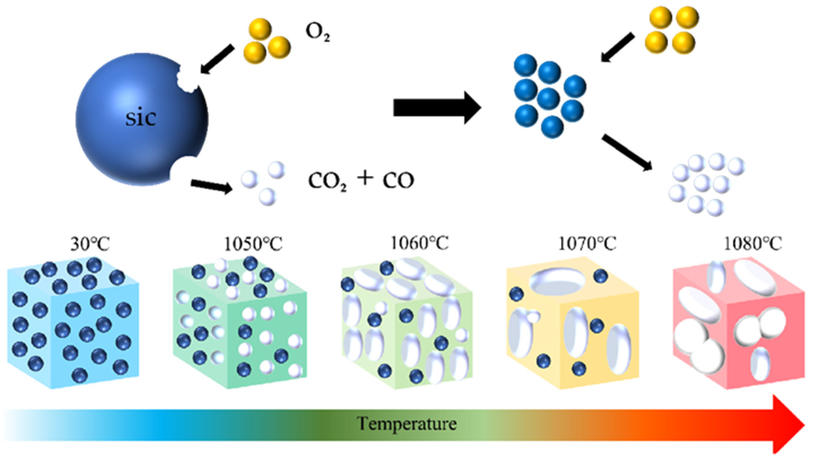 As the temperature continued to rise to 1050 °C, potassium and Na2O reacted with the SiO2 layer, forming a low-viscosity, flowing silicate phase, which destroyed the passivation layer. This process eliminated the restriction on oxygen transfer, promoting the silicon carbide oxidation reaction into a self-accelerating stage. The gaseous products, primarily CO, were increased rapidly, leading to a significant growth in gas volume. Sub-micron spherical pores began to appear in the melt. At this point, the high viscosity of the melt caused bubbles to grow slowly, preserving a relatively thick pore wall structure between adjacent pores.