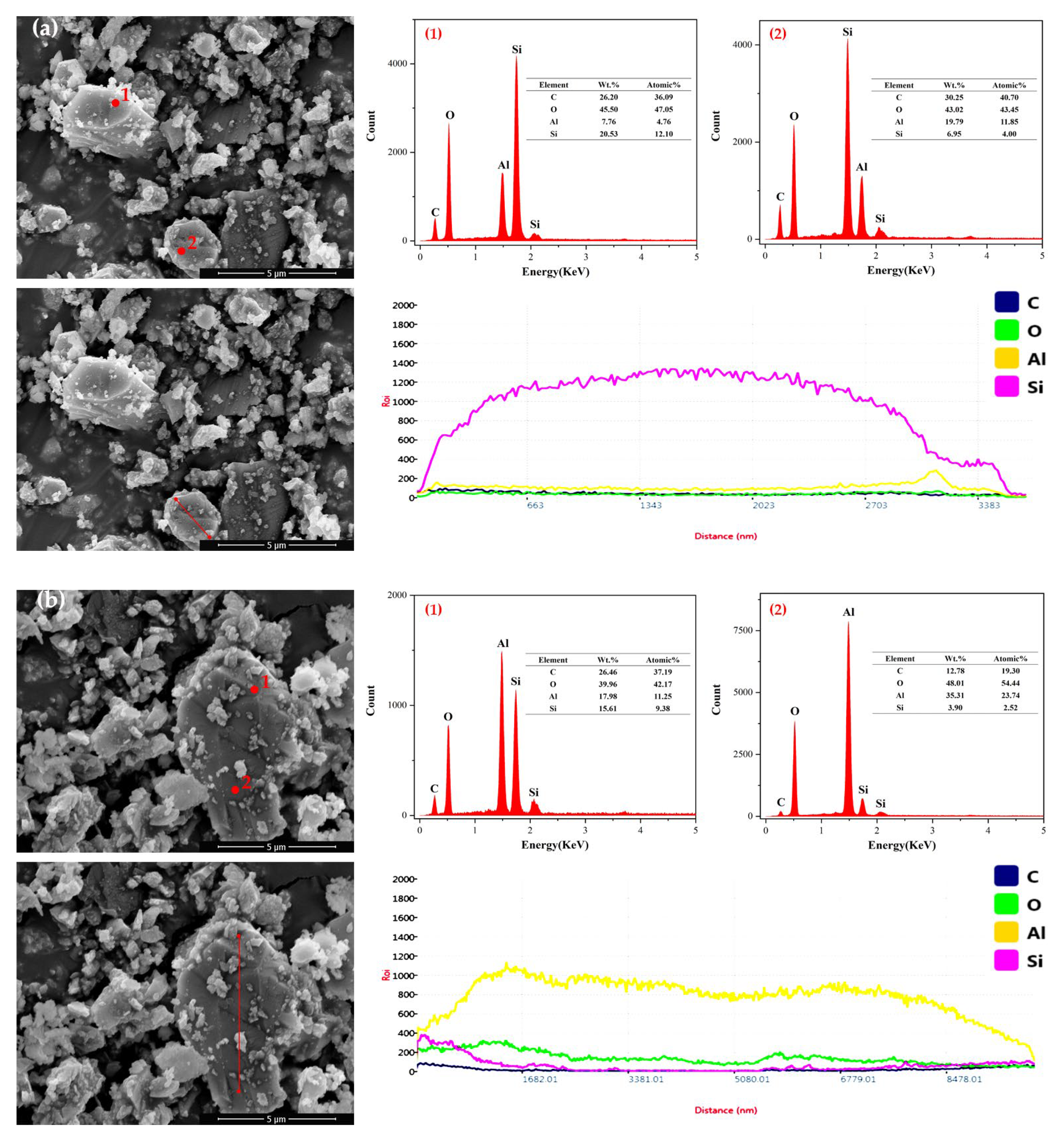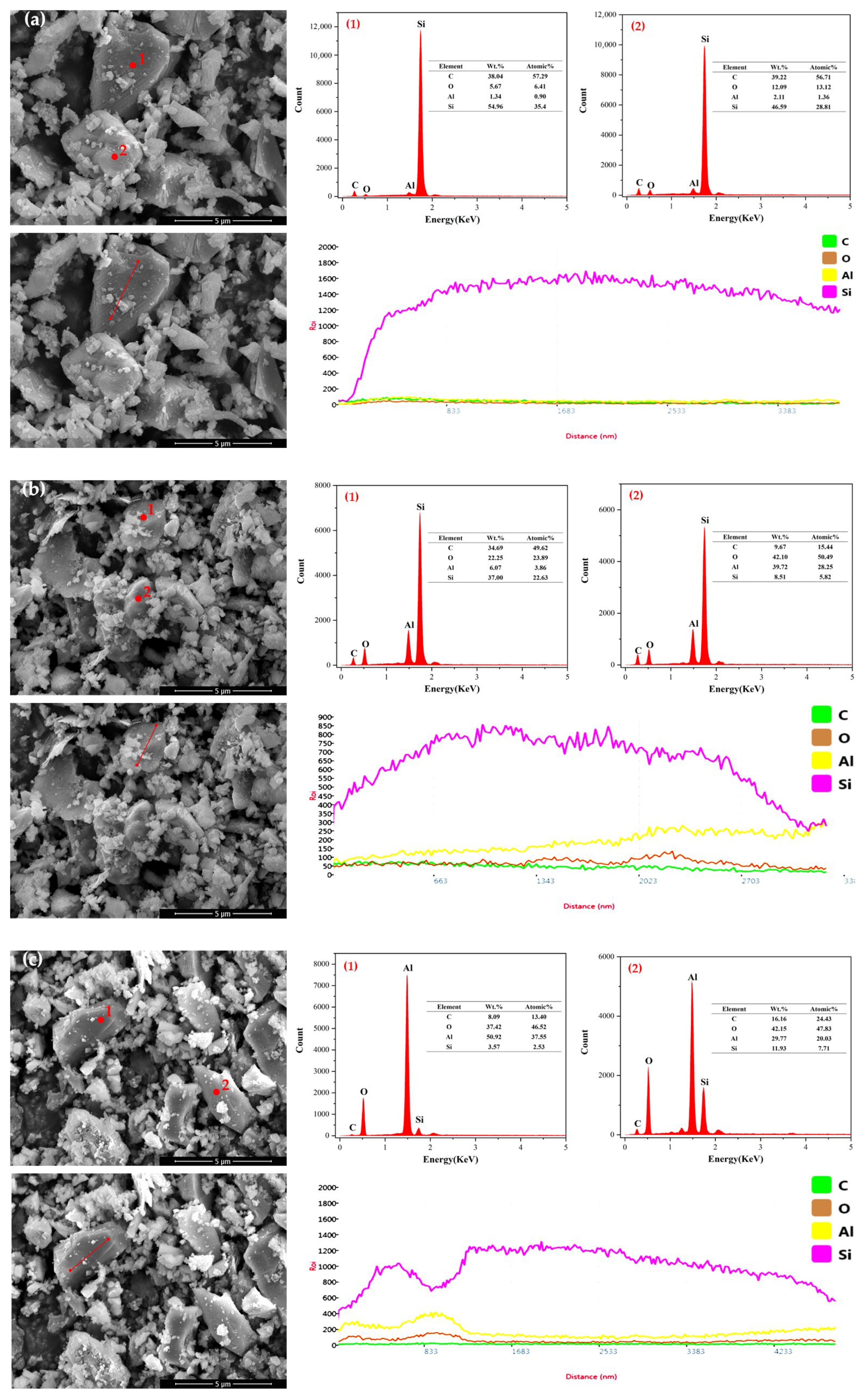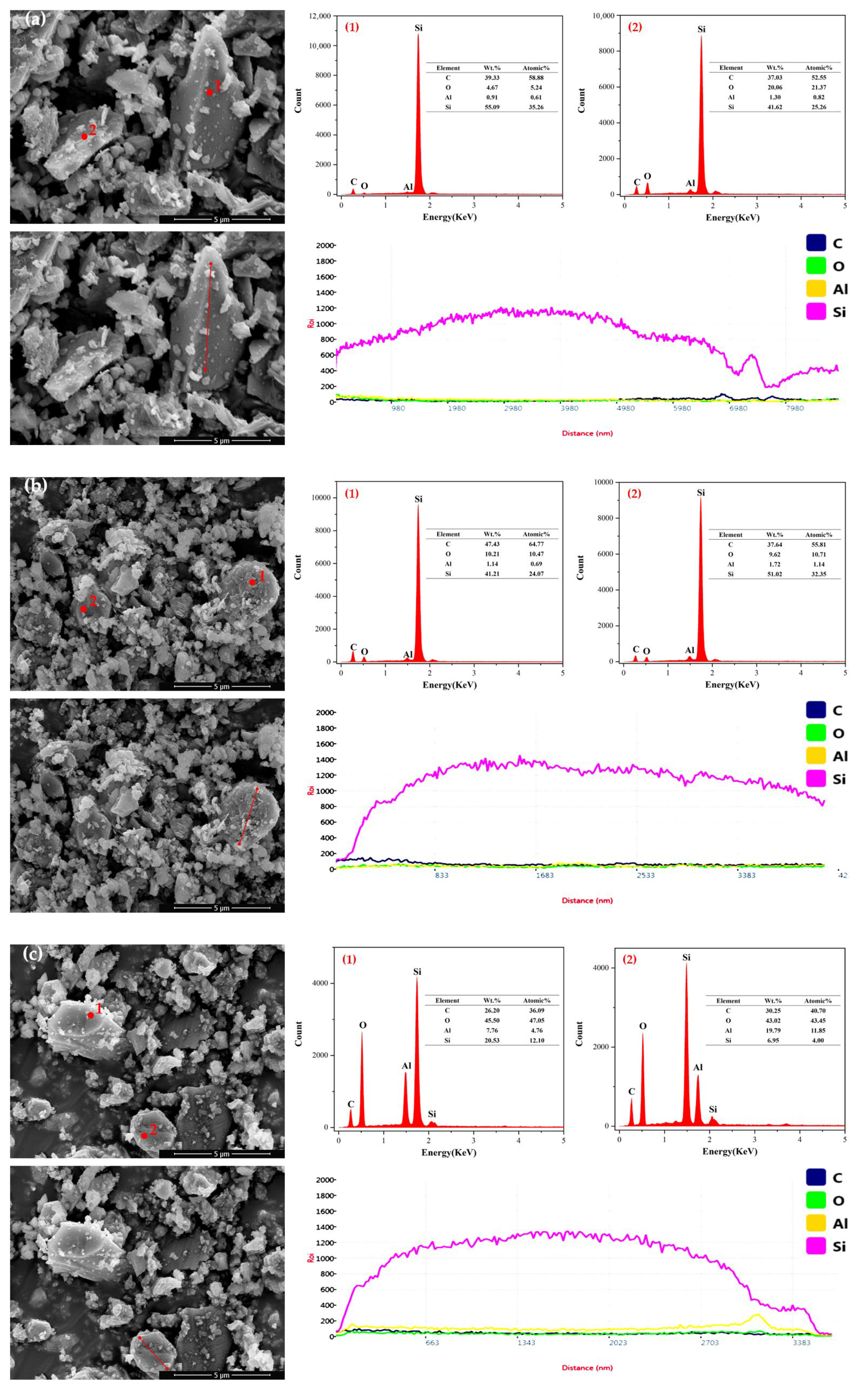 Figure 18. The EDS results indicated that the surfaces of both SiC particles contained four elements: C, O, Al, and Si. This was due to the fact that during the ball milling process, the finer SiC particles increased the surface energy and the reactivity, made it more susceptible to oxidation and led the increased oxygen content. Both. The aluminum content on the particle surfaces was from the ball milling container and grinding balls was made of Al