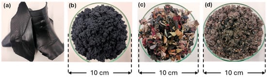 This study utilized two distinct types of post-consumer footwear waste: leather scraps and a heterogeneous footwear mixture. The leather materials were sourced from Lipor, the municipal waste management authority serving the Grande Porto area in Portugal. In contrast, the mixed footwear waste, already subjected to preliminary grinding, was supplied by the Centro Tecnológico do Calçado de Portugal.