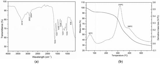 The ATR-FTIR and TG/DTG spectra of the leather residue are shown in Figure 2. The ATR-FTIR spectrum is very similar to that of collagen, which is expected since it is the main component of leather. The intense band at 1633 cm−1 corresponds to C=O stretching, indicating the presence of amide I. The presence of amide II and amide III is confirmed by the bands at 1547 cm−1 (peptide bond) and 1231 cm−1 (collagen), respectively, which are associated with N-H bending and C-N stretching. The hydrogen bonds from the interaction between collagen and water are visible in the bands at 3316 cm−1 and 2923 cm−1, which are associated with OH/NH and NH stretching, respectively. Carbohydrate moieties in collagen proteoglycans are characterized by spectral bands at 1035 cm−1 and 838 cm−1, associated with C–O stretching and C–O–C stretching. The bands at 1446 cm−1 and 1328 cm−1 are attributable to CH2 and CH3 bending, referred to as aliphatic absorptions [41,42].