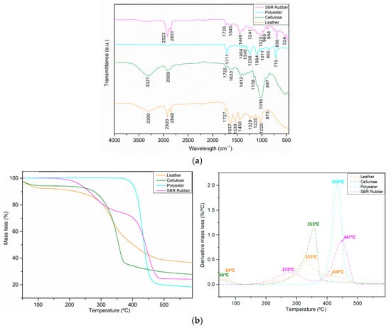 The thermogravimetric analysis (Figure 3b) corroborated the ATR-FTIR analysis. For leather residue, two regions were observed within the temperature range from room temperature to 600 °C. The principal mass loss, due to collagen decomposition, occurs between 240 °C and 550 °C. In the DTG spectrum, the three characteristic peaks of leather are visible at 64 °C, 333 °C, and 400 °C. This spectrum is very similar to the previous one obtained for leather (Figure 2b). Cellulose (green line) has two distinct mass loss regions: a minor loss up to 102 °C, attributed to water vaporization, and a more significant loss (60%) between 250 °C and 380 °C, corresponding to cellulose dehydration and decomposition, with a maximum degradation peak at 355 °C [50]. Polyester exhibits only one decomposition zone, with a significant mass loss of nearly 80%, occurring between 380 °C and 475 °C [51]. The major decomposition of polyester occurs at 435 °C. SBR rubber (rose line) also exhibits two mass loss regions: the first shows a 25% mass loss between 180 °C and 347 °C, while the second shows a 50% mass loss between 385 °C and 485 °C. This initial decomposition step at 278 °C is due to the degradation of butadiene or the breakdown of plasticizers and additives present in the rubber. The main degradation is associated with the thermal decomposition of the styrene component and the polymer backbone of SBR rubber, with the degradation peak at 447 °C [52].