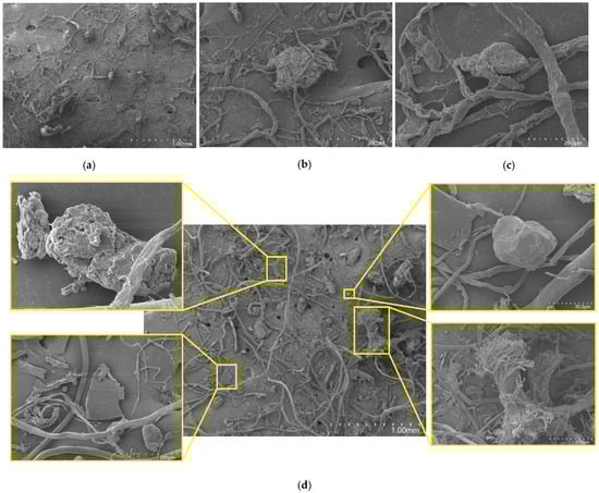 SEM images of the residues, depicting their morphological characteristics and dispersion. (a) Leather residue, 110×; (b) leather residue, 650×; (c) leather residue, 5000×; (d) footwear mixture.