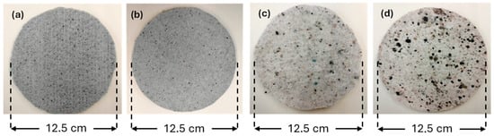 Nonwoven structures produced with post-consumer footwear waste. (a) Sample A (uncompressed leather nonwoven); (b) sample B (compressed leather nonwoven); (c) sample C (uncompressed footwear mixture nonwoven); (d) sample D (compressed footwear mixture nonwoven).