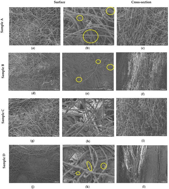 SEM images of surface and cross-sections of samples A, B, C, and D at different magnifications, illustrating their morphological features, fiber distribution, and structural compactness. (a) 110×; (b) 650×; (c) 110×; (d) 110×; (e) 650×; (f) 110×; (g) 110×; (h) 650×; (i) 110×; (j) 110×; (k) 650×; (l) 110×.