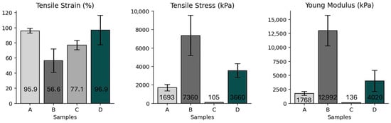 Sample C exhibited the lowest mechanical performance, with a tensile strength of only 104.9 kPa, a Young’s modulus of 136.1 kPa, and a strain of 77.1%. The weak performance is attributed to the uncompressed structure and the heterogeneity of the footwear waste, which contains materials with different sizes, textures, and chemical properties, resulting in reduced cohesion and fiber interlocking. When compressed, sample D showed notable improvements in both strength and stiffness. The tensile strength increased to 3559 kPa, and Young’s modulus rose to 4020.4 kPa, while maintaining a high strain of 96.9%. Although the improvements are less pronounced than in sample B, the enhanced performance still reflects the effectiveness of compression in reinforcing the fibrous structure. The variability in the mechanical response of sample D is likely influenced by the heterogeneous nature of the post-consumer footwear waste.