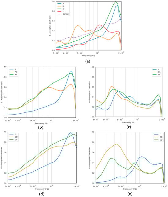 Frequency-dependent sound absorption coefficient of the samples, highlighting differences in acoustic performance related to material composition and structure in (a) single samples A–D; (b) coupling of sample A; (c) coupling of sample B; (d) coupling of sample C; (e) coupling of sample D.