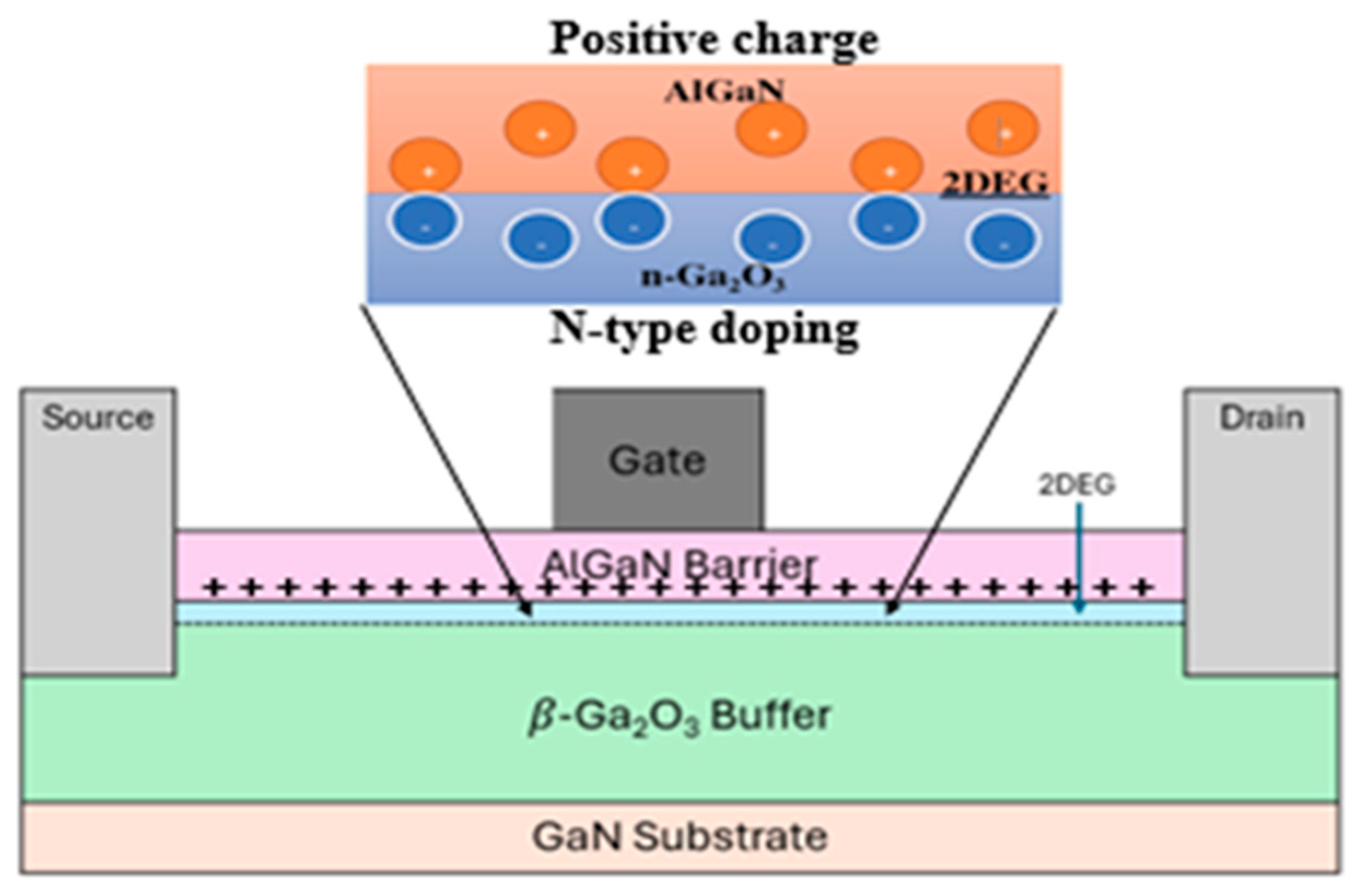 - Nirmala Devi, K.; Keerthiga, G.; Ravi, S.; Murugapandiyan, P. High-performance GaN-based HEMTs with β-Ga2O3 buffer layer engineering for millimeter-wave applications. J. Korean Phys. Soc. 2025, 87, 787–808. [Google Scholar] [CrossRef]