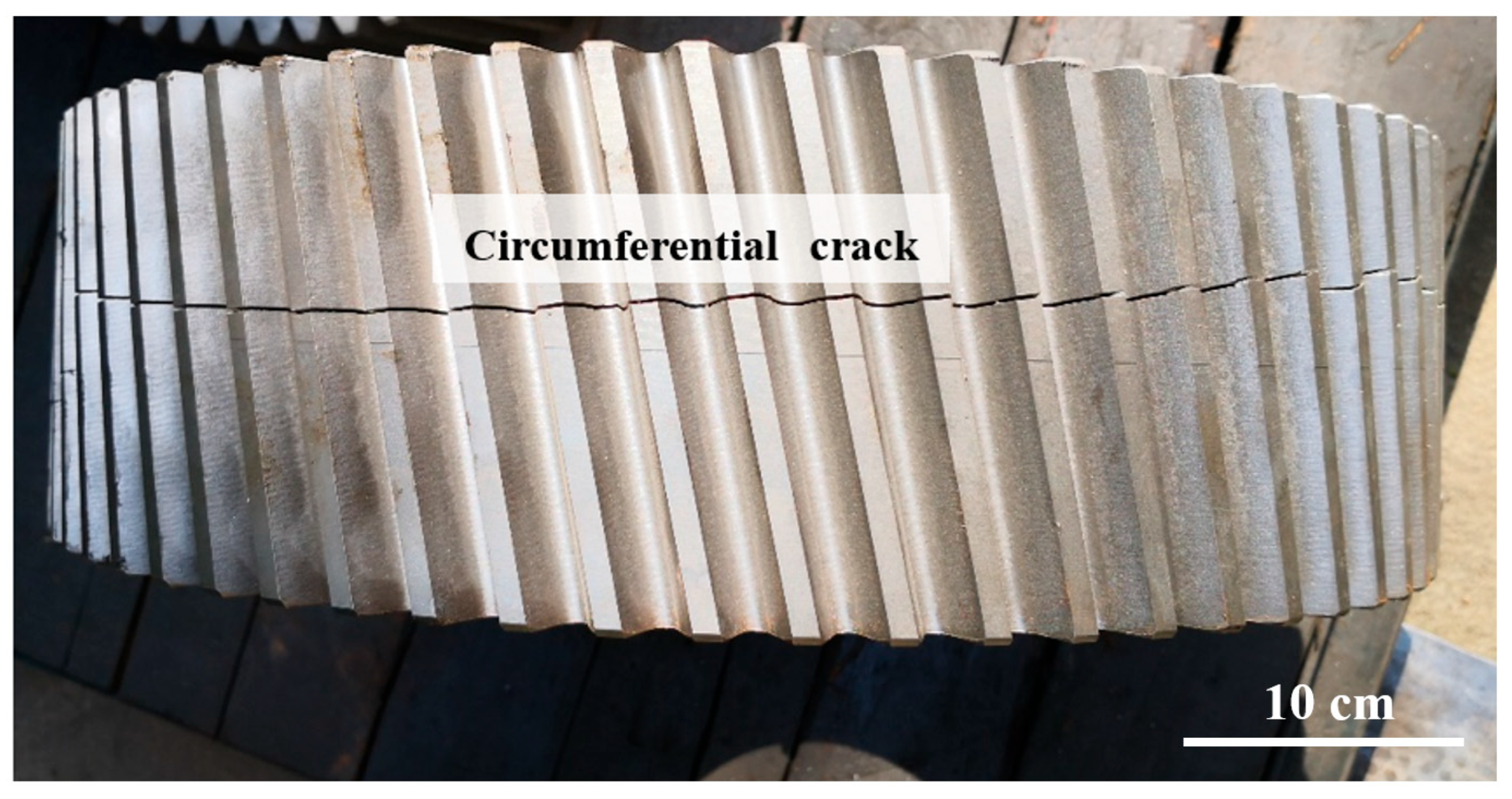 The rapid expansion of rail transit infrastructure in China has yielded remarkable achievements in both network mileage and construction scale, significantly alleviating urban traffic congestion and reducing environmental pollution, thereby generating substantial socio-economic benefits [1,2]. Within this context, the gear transmission system serves as a critical component for power transfer in railway trains, transmitting torque from the traction motor to the wheelset. Compared to conventional industrial gears, railway gears operate under more demanding conditions—characterized by high rotational speeds, significant load shocks, and a broad operating temperature range—making them susceptible to unexpected failures [3,4]. Consequently, failure analysis of these components has become a major focus for railway engineers.