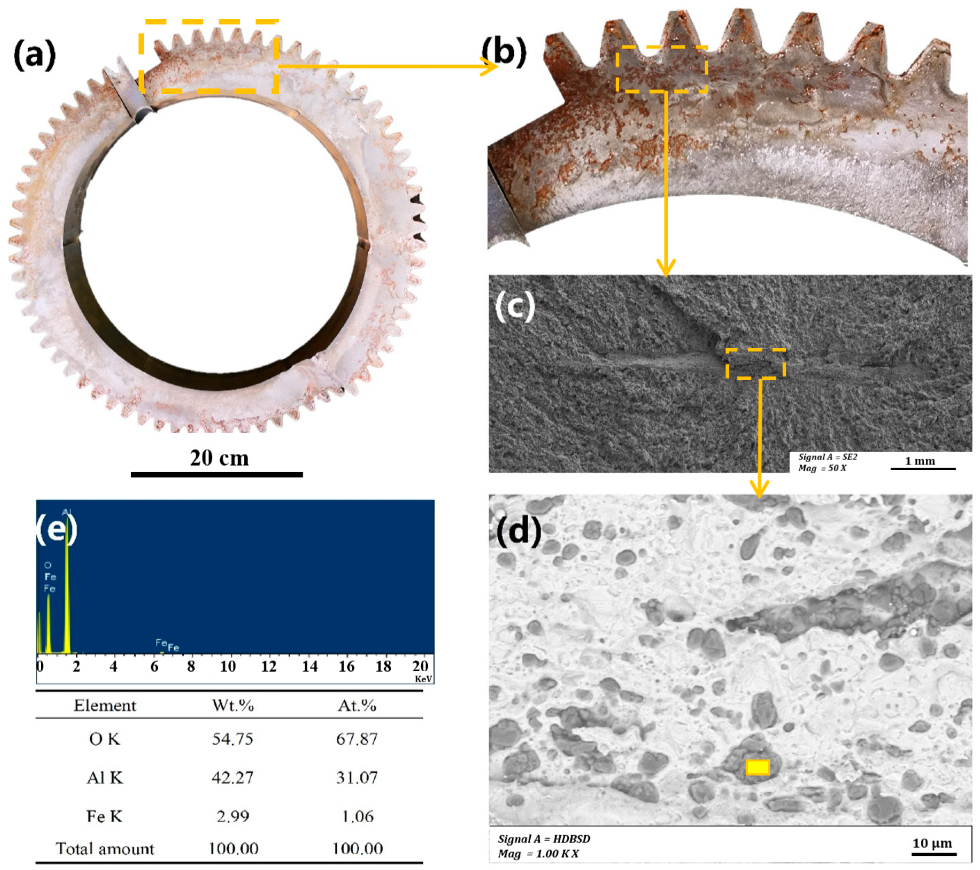 Figure 2. Failure overview of the gear: (a) appearance of the failed gear, (b) crack source, (c) micro-morphology of slag inclusion, (d) BSE image, and (e) EDS pattern of slag inclusion at the yellow mark in (d).