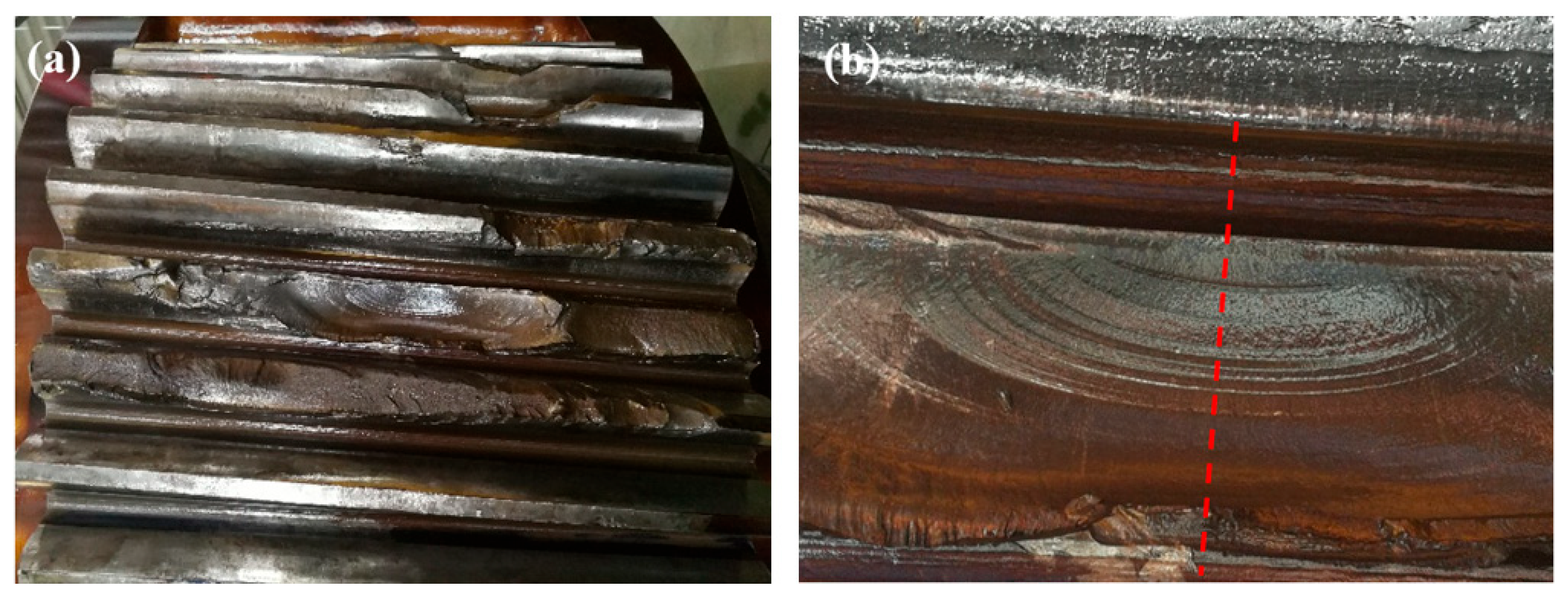 Figure 3 shows the digital camera photos of the failed gear. In Figure 3a, there is severe wear near the meshing area of each tooth surface, accompanied by traces of plastic deformation due to rolling, brittle fracture, and varying degrees of fatigue fracture. According to Figure 3b, the fatigue source of a fractured tooth is located at the tooth root. In this part, obvious shell-shaped traces are found, with typical fatigue fracture characteristics.
