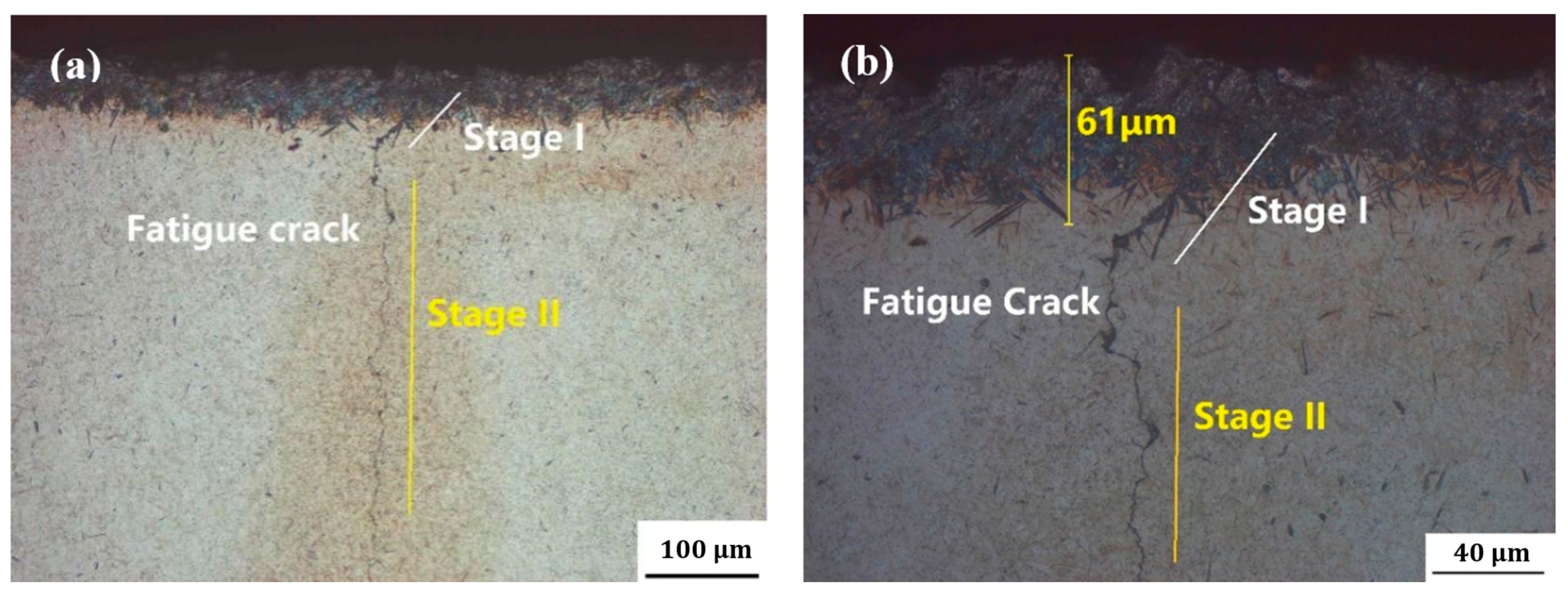 Figure 4 shows the metallographs of the cross-section near the fatigue source. A fine crack of approximately 0.6 mm in length was observed near the crack initiation site, likely formed by impact during shot peening. Metallographic examination at the gear tooth root revealed a non-martensitic structural layer with a depth of approximately 60 μm, predominantly composed of coarse upper bainite. This microstructural anomaly, identified in the transition zone, fails to meet the microstructural integrity requirements specified for the hardened case in GB/T 25744—2010 [23].