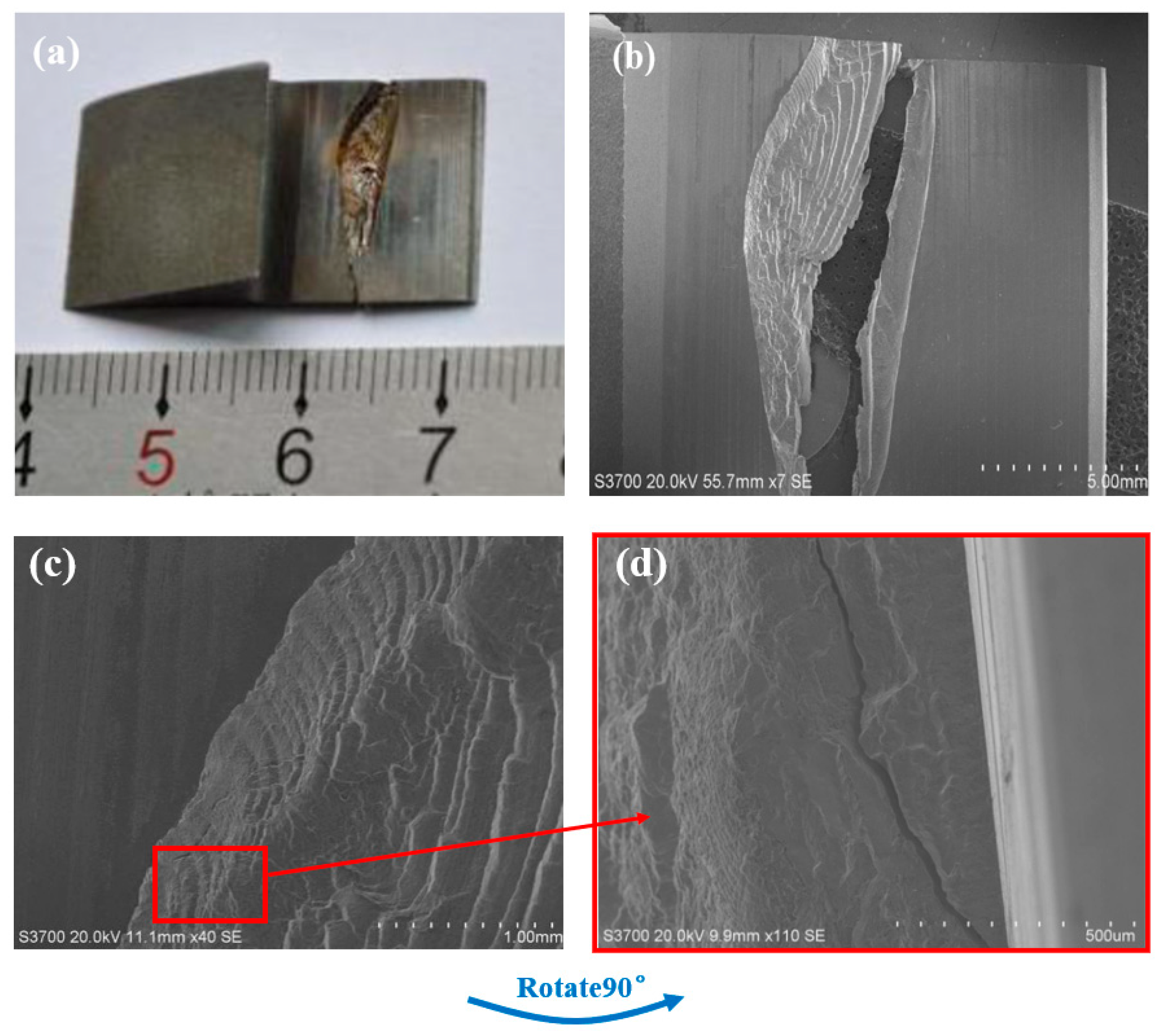 Figure 1 shows the digital camera photo of a model locomotive gear shaft, which is made from the material 18CrNiMo7-6; the surface is heat-treated with carburizing and quenching processes. However, when the gear is finally quenched, a circumferential crack appears, and the crack penetrates all gear teeth. Interestingly, cracks do not occur at stress concentration positions, such as tooth roots or transition fillets. Through wire cutting, the gear is dissected along the crack so that the crack can be opened manually and more fracture characteristics can be observed.