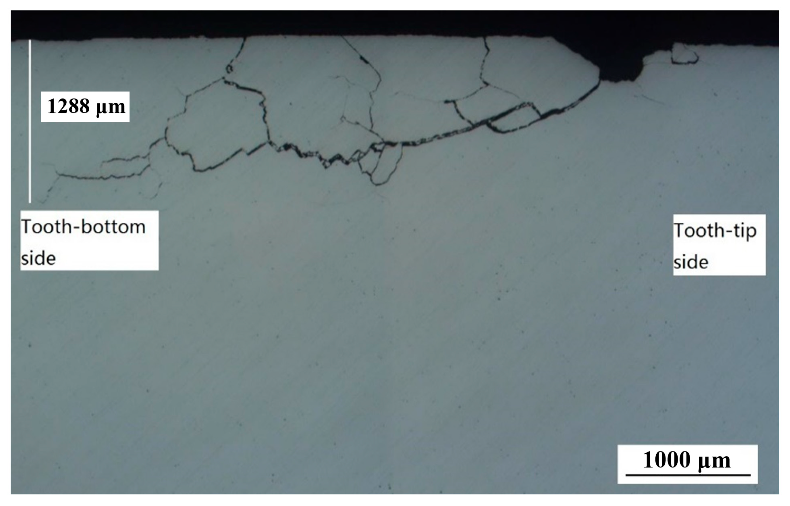 The surface-hardened layer’s depth significantly affects the gear’s contact fatigue and bending fatigue performance. The tooth flaking depth is related to contact stress and relative sliding velocity. The maximum depth of shear stress under contact stress is 0.786b. For the gear to have sufficient contact fatigue resistance, the depth of the layer should be twice that of the maximum shear stress. Therefore, the hardened layer should be as thick as possible to improve the gear’s anti-contact fatigue capacity [23]. However, as there is an optimum value for the bending fatigue resistance of gears, a hardened layer that is too shallow or too deep will cause the gear’s bending fatigue performance to decline. A driving gear manufactured from 20CrMnMo steel failed by cracking after only 18 months of service. The manufacturing process consisted of forging, normalizing, hobbing, carburizing, quenching (850 °C) with low-temperature tempering (610 °C), gear grinding, and shot peening.