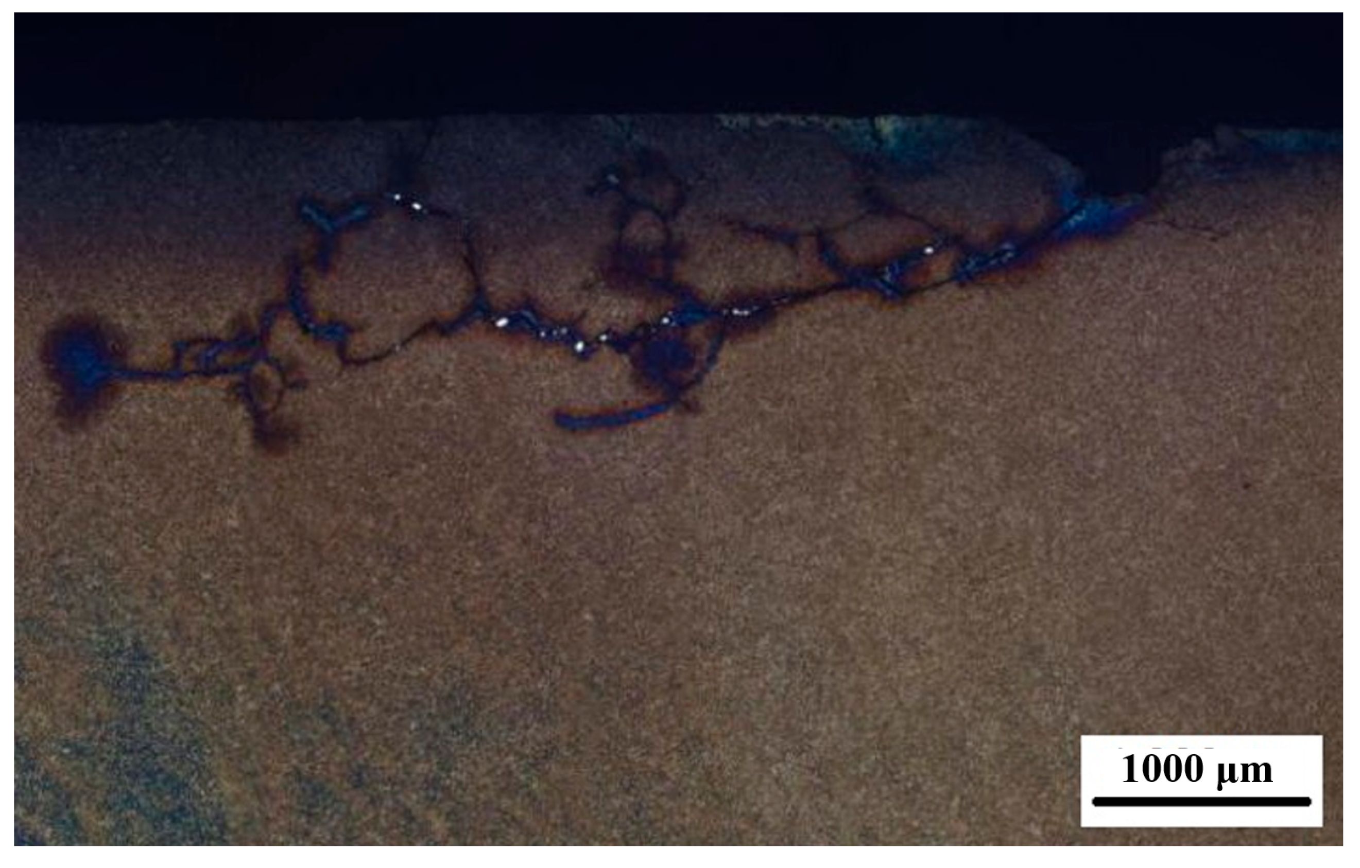 As shown in Figure 7, the crack exhibits a wide opening and propagates at an angle of approximately 45° to the surface, terminating in a thin upturned tail. Three branching cracks in the central region extend toward the surface, displaying characteristic features of contact fatigue. Figure 8 shows the metallographs from both sides of the crack after etching with nitric acid ethanol solution. Crescent-shaped ‘dark spots’ are visible in the tooth flanks adjacent to the defects. These ‘dark spots’ show greater susceptibility to etching compared to the surrounding material. The microstructure in these regions consists of middle-tempered martensite with dispersed granular carbides. The precipitation of these carbides likely resulted from the decomposition of retained austenite during the secondary tempering stage, indicating that the ‘dark spot’ areas experienced thermal exposure, with temperatures reaching the tempering range of 350 °C to 500 °C.