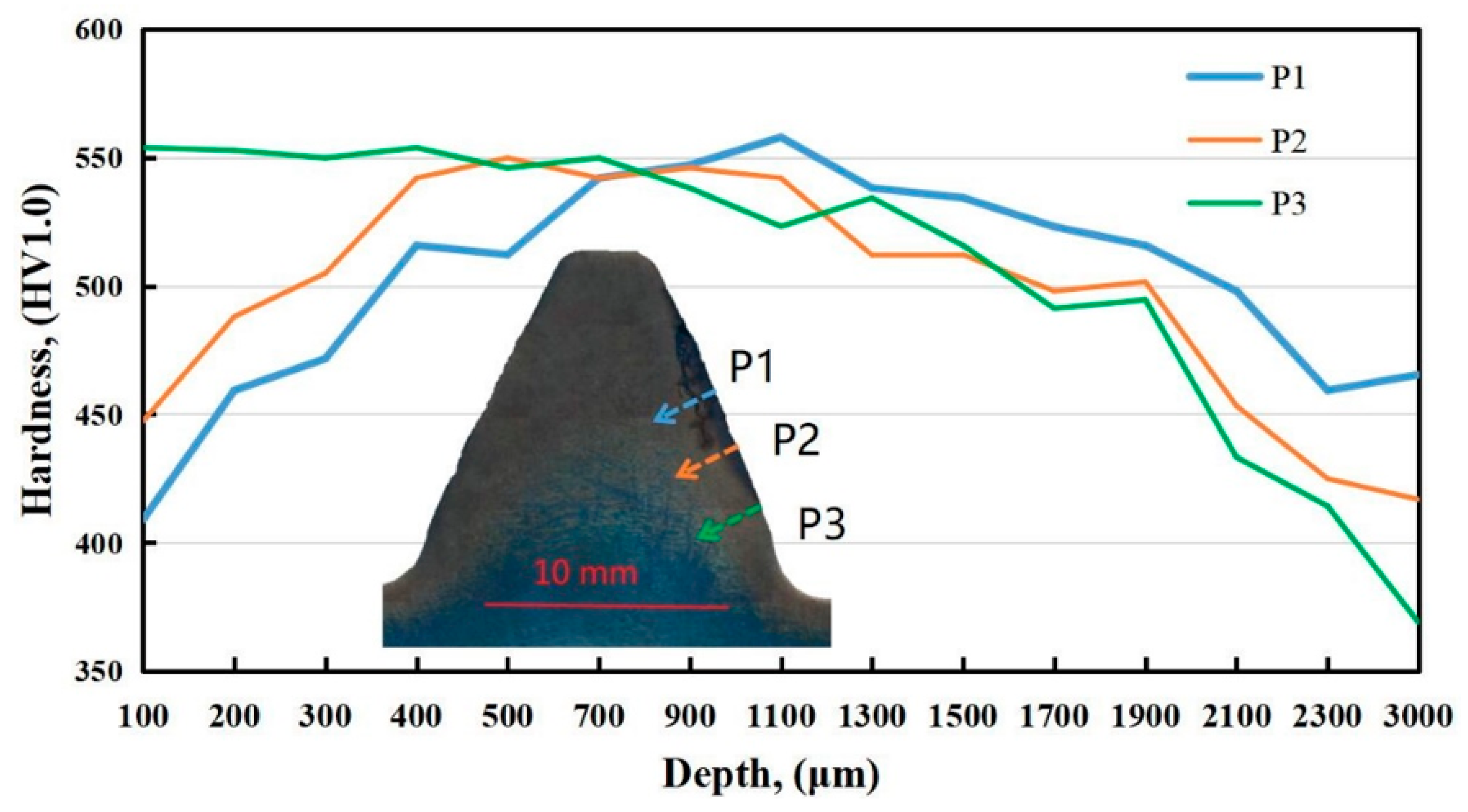 Figure 9. Hardness curve of the middle area (P1), edge area (P2) of the black spot, and normal area (P3).