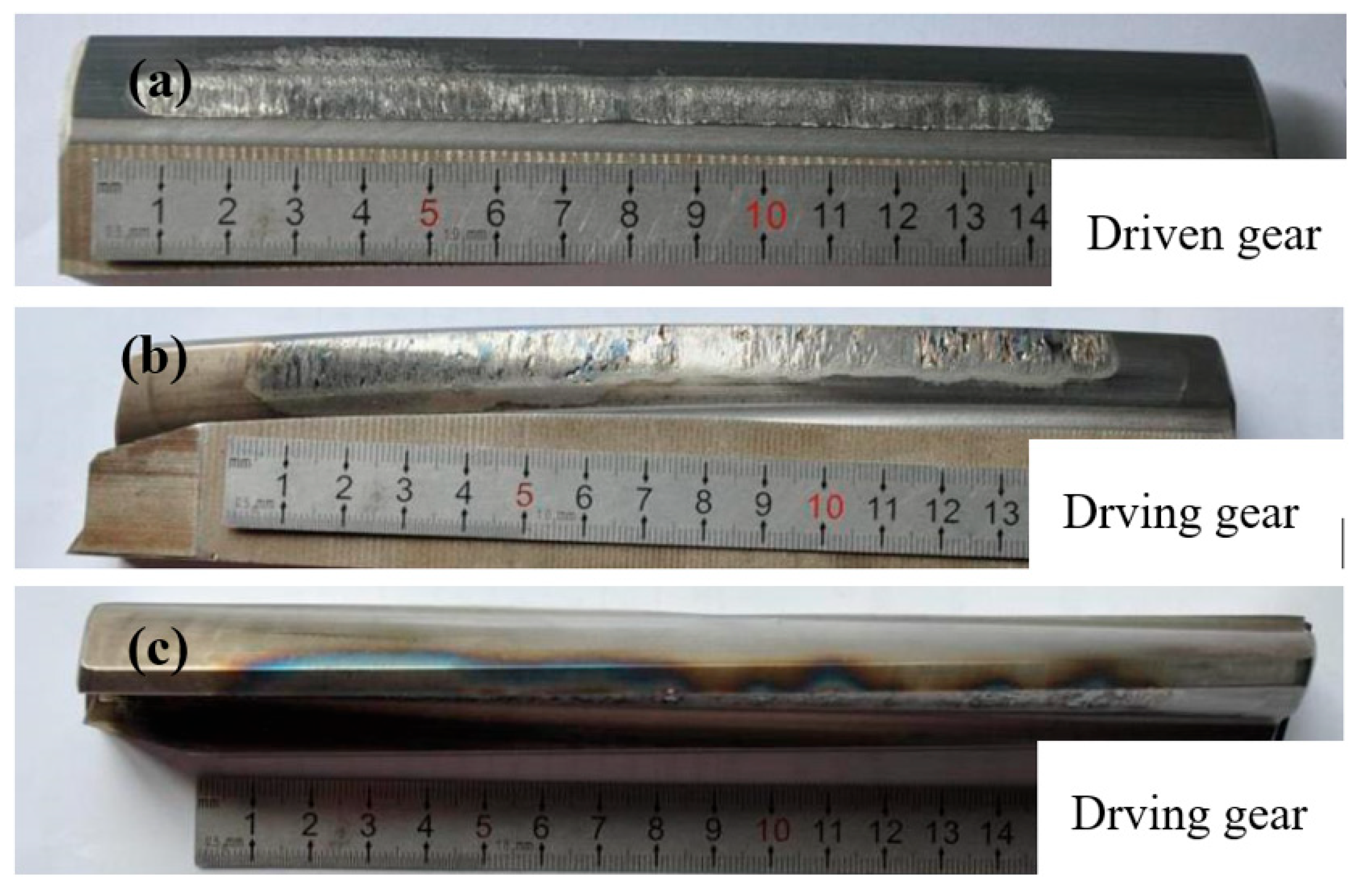 Figure 10. Digital camera photos of the driven and driving gear: (a) tooth surface of the driven gear, (b) tooth surface of the driving gear, and (c) tooth tip of the driving gear.