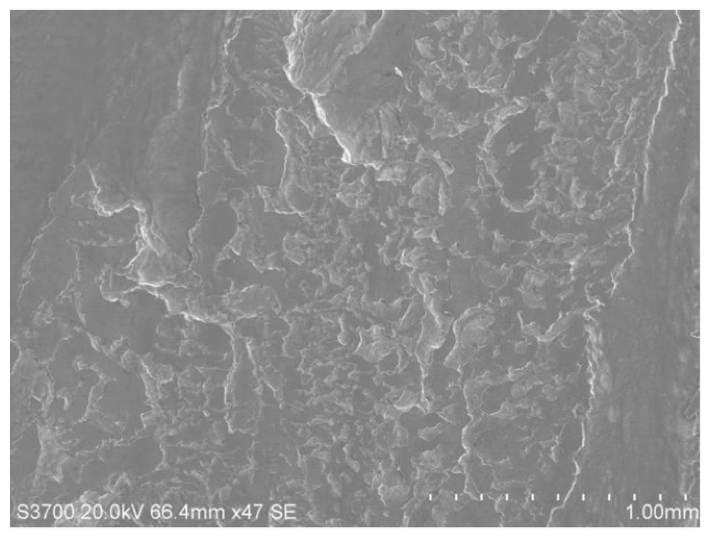 Figure 10 shows the digital camera photos of a type of locomotive’s gear tooth’s flank surface. The mating surfaces of the driving and driven gears are damaged, leading to a belt-shaped rough portion. The top of the driving gear tooth is blue and tempered in color, showing the characteristics of hot scuffing. Figure 11 shows the SEM image of tooth surface damage of the driving gear, showing that the microscopic damage is caused by adhesive wear.