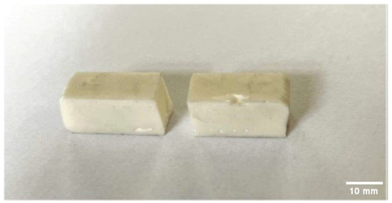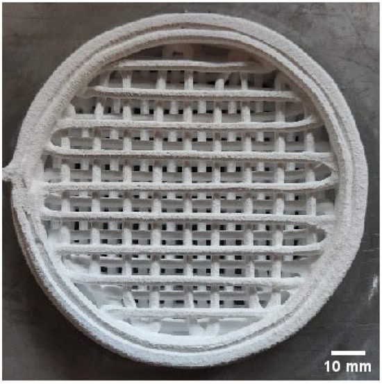 The next stage of the process comprised drying and removal of organic constituents (debinding). Drying was carried out under ambient conditions at 21 °C for 48 h. The dried filters and rectangular prismatic specimens were then subjected to a burnout step at 200 °C for 2 h, with a heating rate of 10 °C/h. A representative view of the filter after the organic-removal (debinding) stage is shown in Figure 2.