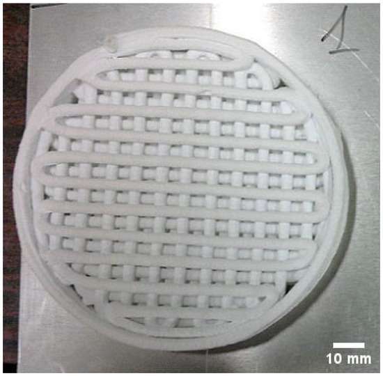The prepared ceramic paste was subsequently used to fabricate ceramic filters (Figure 1) and rectangular prismatic specimens with a cross-section of 10 × 10 mm. The prismatic specimens were printed with solid infill (100%). During 3D printing, a 2 mm nozzle was employed.
