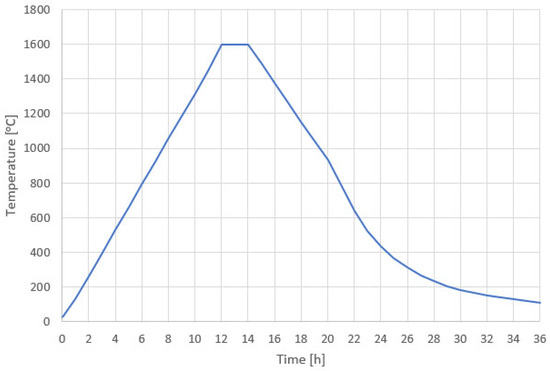 The final stage of the process was ceramic sintering. Samples were sintered in ambient air (no controlled atmosphere was employed). The furnace was heated at an average rate of ~133 °C/h to 1600 °C, soaked at 1600 °C for 2 h, and then furnace-cooled (cooled with the furnace) with an average cooling rate of ~68 °C/h between 1600 and 100 °C, followed by passive cooling to room temperature. The total thermal cycle time was ~36 h. The sintering temperature profile is shown in Figure 3.