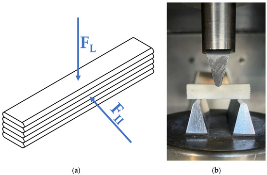 Three-point bending of solid specimens: (a) schematic of the loading direction relative to the printed layers (FL for SBL samples and FII for SBII samples); (b) representative view of a mounted specimen in the testing machine during the test.