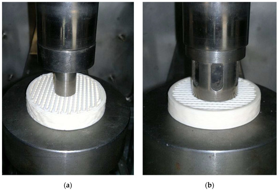 Representative view of ceramic filters during compressive strength testing: (a) 22 mm-diameter platen (FP22); (b) 40 mm-diameter platen (FP40).