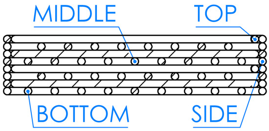 The analysis was conducted on metallographic cross-sections prepared from transverse sections of specimens cut from the ceramic filters and, for comparison, on solid specimens (SC) after pressureless sintering. Following the adopted methodology, measurements were taken in four characteristic regions of the filters: the top lamella (FT), middle lamella (FM), bottom lamella (FB), and the side wall (FS), as schematically shown in Figure 6.