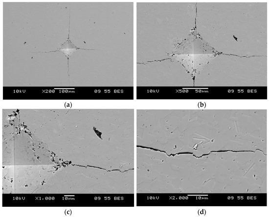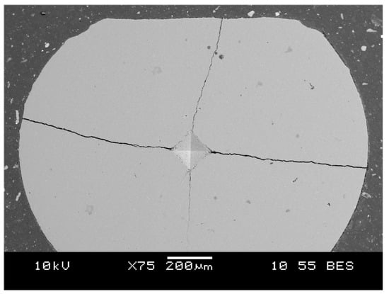 An attempt was made to determine fracture toughness at a load of 30 kgf (HV30); however, the generated cracks reached the edges of the lamella cross-sections (Figure 7), which precluded a reliable determination of KIC(HV). Consequently, a load of 10 kgf (98.1 N; HV10) was employed, which yielded indentations with proper geometry and single cracks emanating from the indentation corners. Based on the measured indentation diagonals and crack lengths, the values of KIC(HV) were calculated.