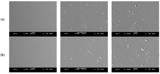 Young’s modulus was determined by the ultrasonic method. Transit times of longitudinal and transverse ultrasonic waves through the specimens were measured using a digital flaw detector EPOCH 3 (Olympus, Tokyo, Japan) equipped with broadband transducers. The elastic constants were calculated from the ultrasonic wave velocities in the material and the specimen density using the Modulus 1.0 software. Young’s modulus was then computed using the following Equation (2):